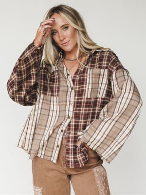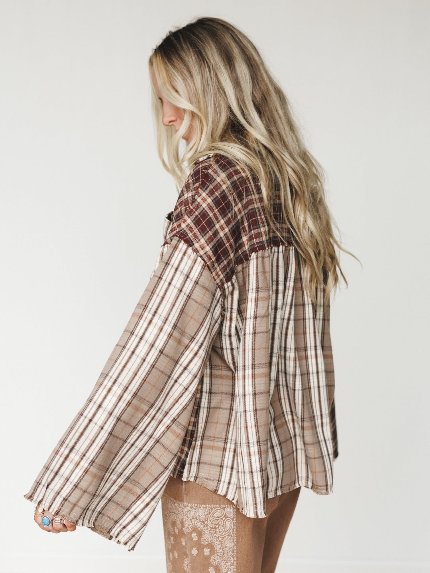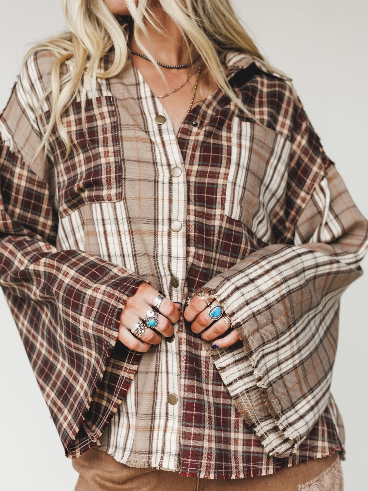 Add a little edge to your cozy layers with the Plaid Flannel Bell Sleeve Top. Designed with a mix of earthy tones and dramatic bell sleeves, this piece is made for the modern boho babe who loves to stand out—even in flannel.