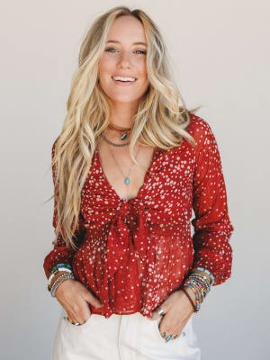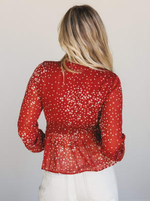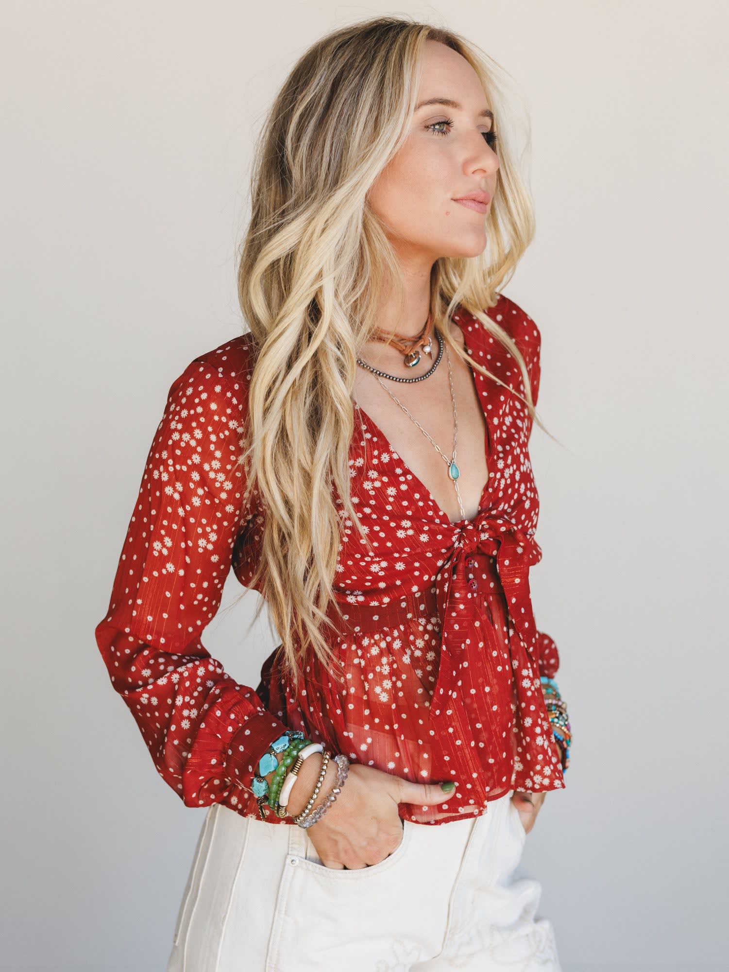 Romantic charm meets playful detail in the Poem Thread Top. This sheer, flowy blouse features a dreamy red base adorned with dainty floral-inspired dots for a soft, whimsical finish. The tie-front design and flattering peplum hem create a feminine silhouette that’s perfect for layering or wearing solo. Whether styled with denim, skirts, or your favorite wide-leg pants, this top adds just the right touch of vintage-inspired flair.