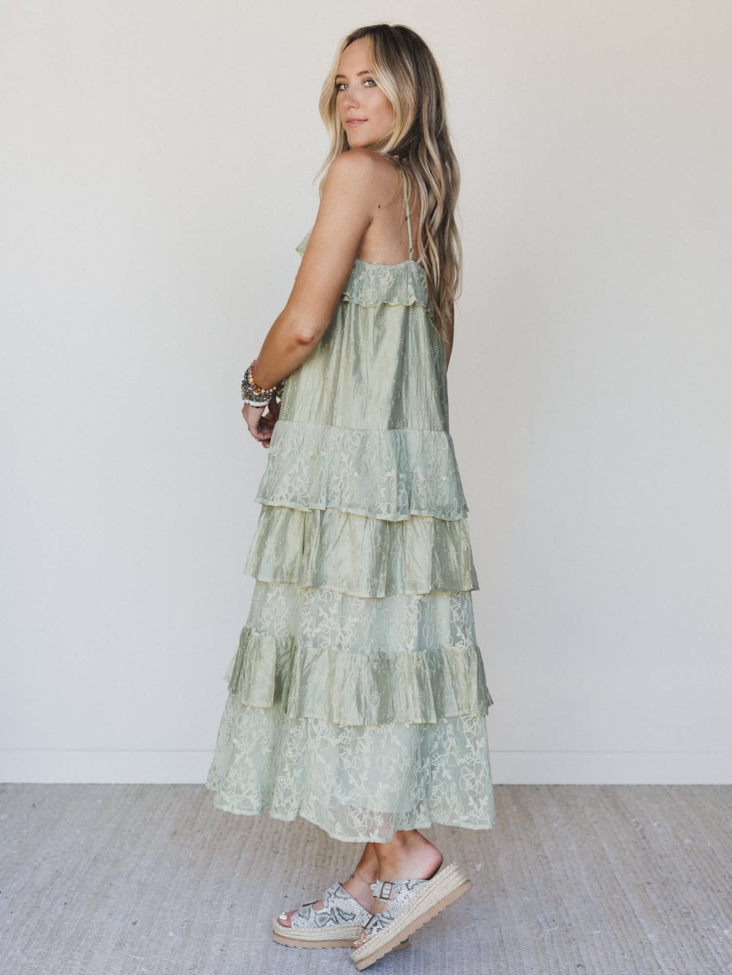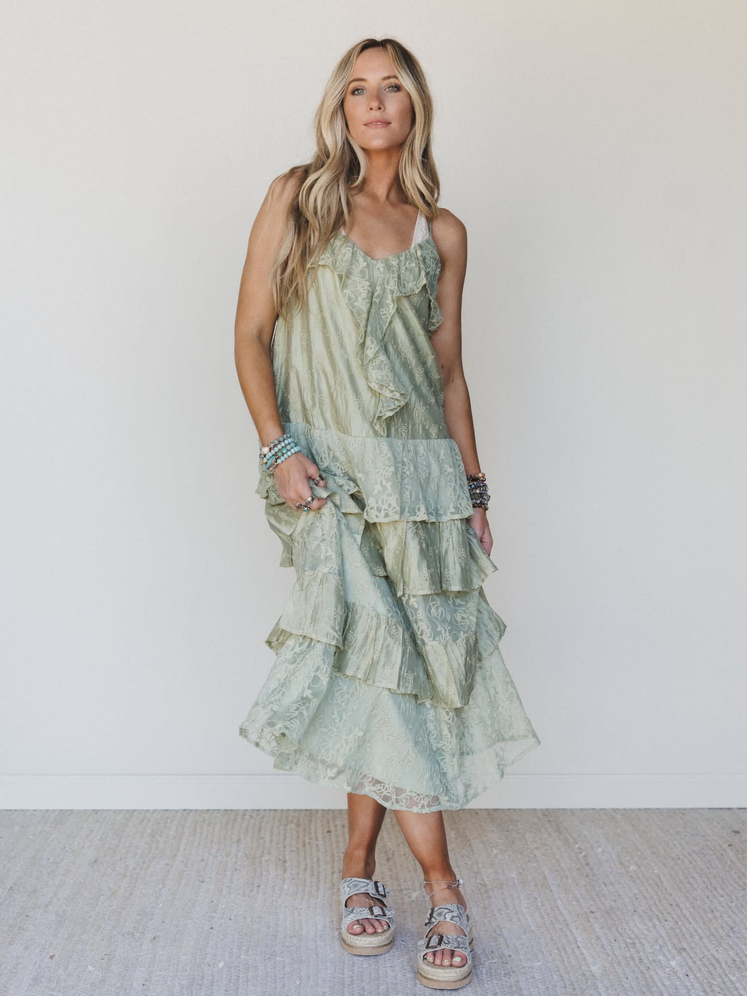 Lace, ruffles, and a shade of green that was made for golden hour — this dress is pure poetry.