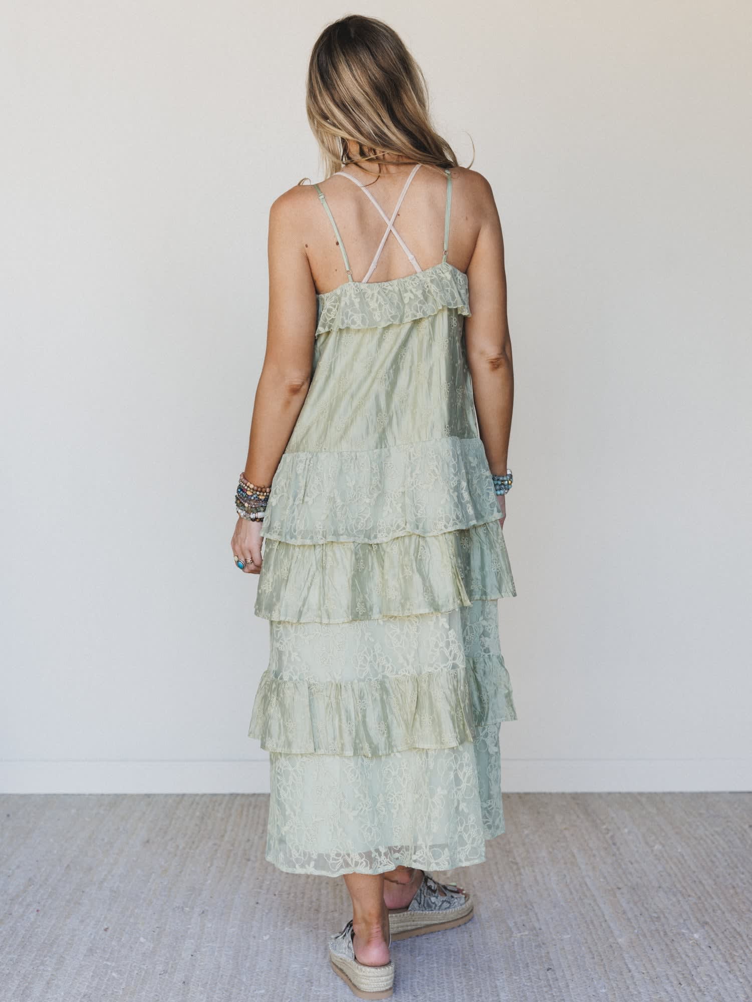The kind of bohemian dress that feels like it belongs in a sun-drenched garden or a dreamy outdoor wedding — this sage green tiered lace maxi is the most romantic thing your wardrobe has ever seen.