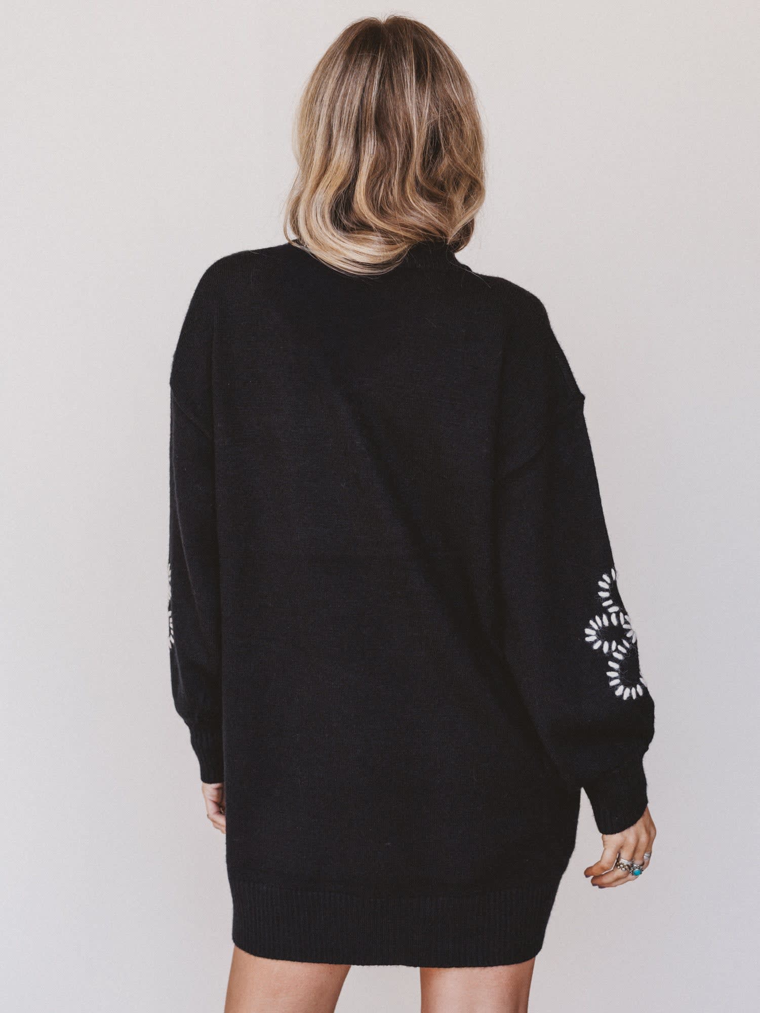 - Black knit sweater dress with white stitched floral designs on front and sleeves
