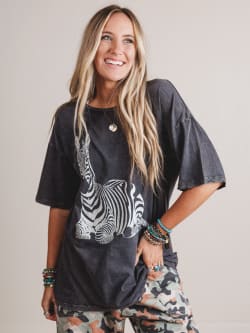 - Zebra Mate Tee: Oversized fit with a playful zebra graphic for that lived-in, vintage feel.