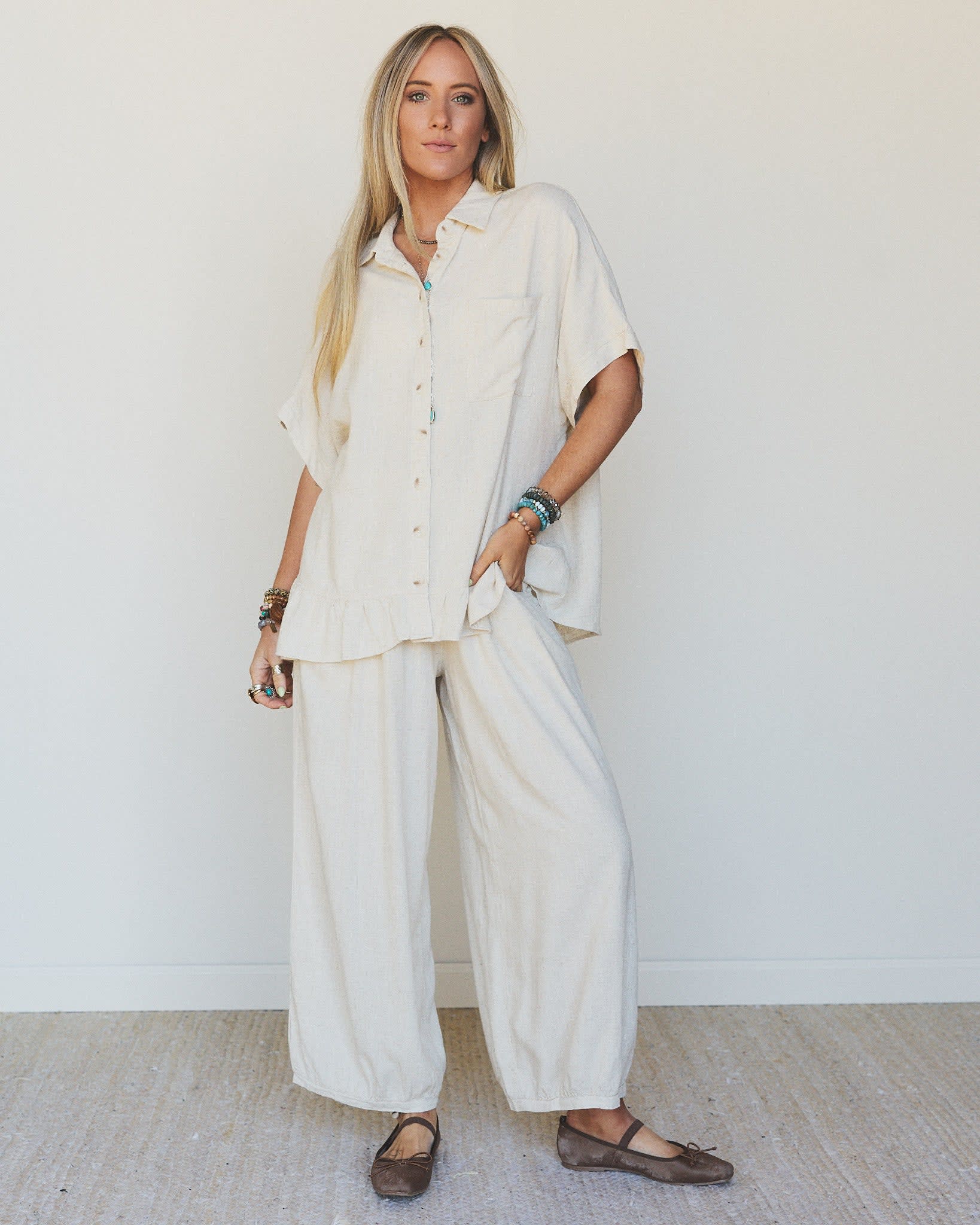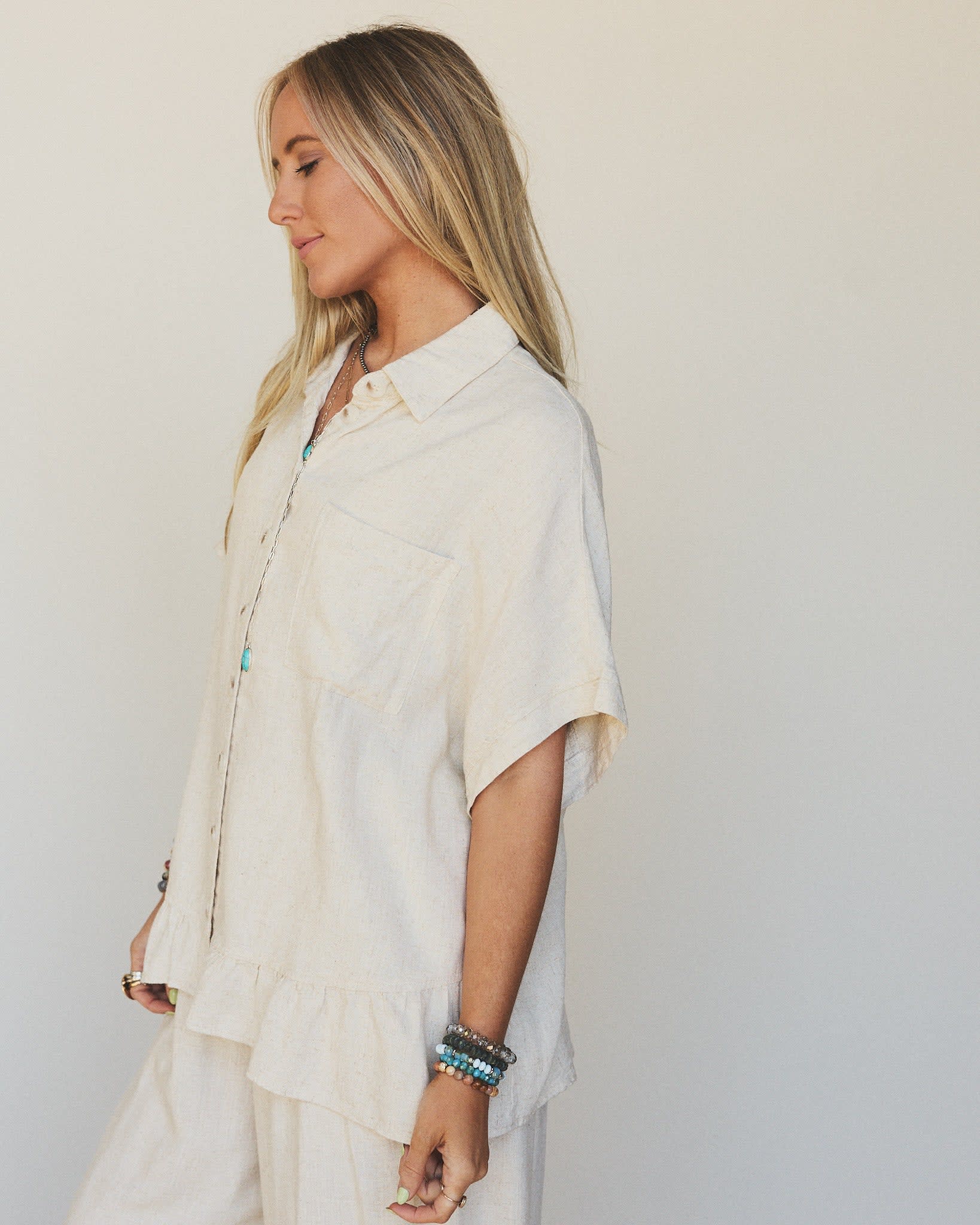• Pure Soul Linen Top: Lightweight and breathable with an oversized button-up fit and pocket detail