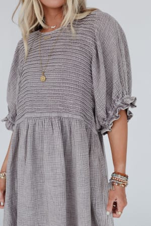 - Babydoll silhouette with mini dress length