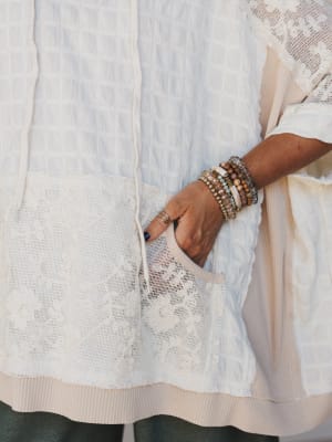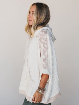 This dreamy hoodie top is a love letter to all things cozy and feminine. With its mix of texture, lace, and soft ivory tones, it brings a romantic twist to your everyday layers.