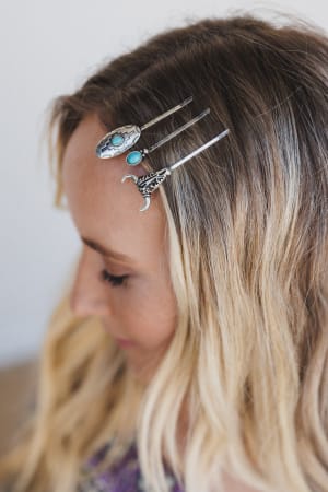 • Add a dash of desert charm to your hairstyle with this turquoise hair pin set. Whether you’re braiding for a beach day or pinning for date night, these boho accessories make your look effortlessly unique.