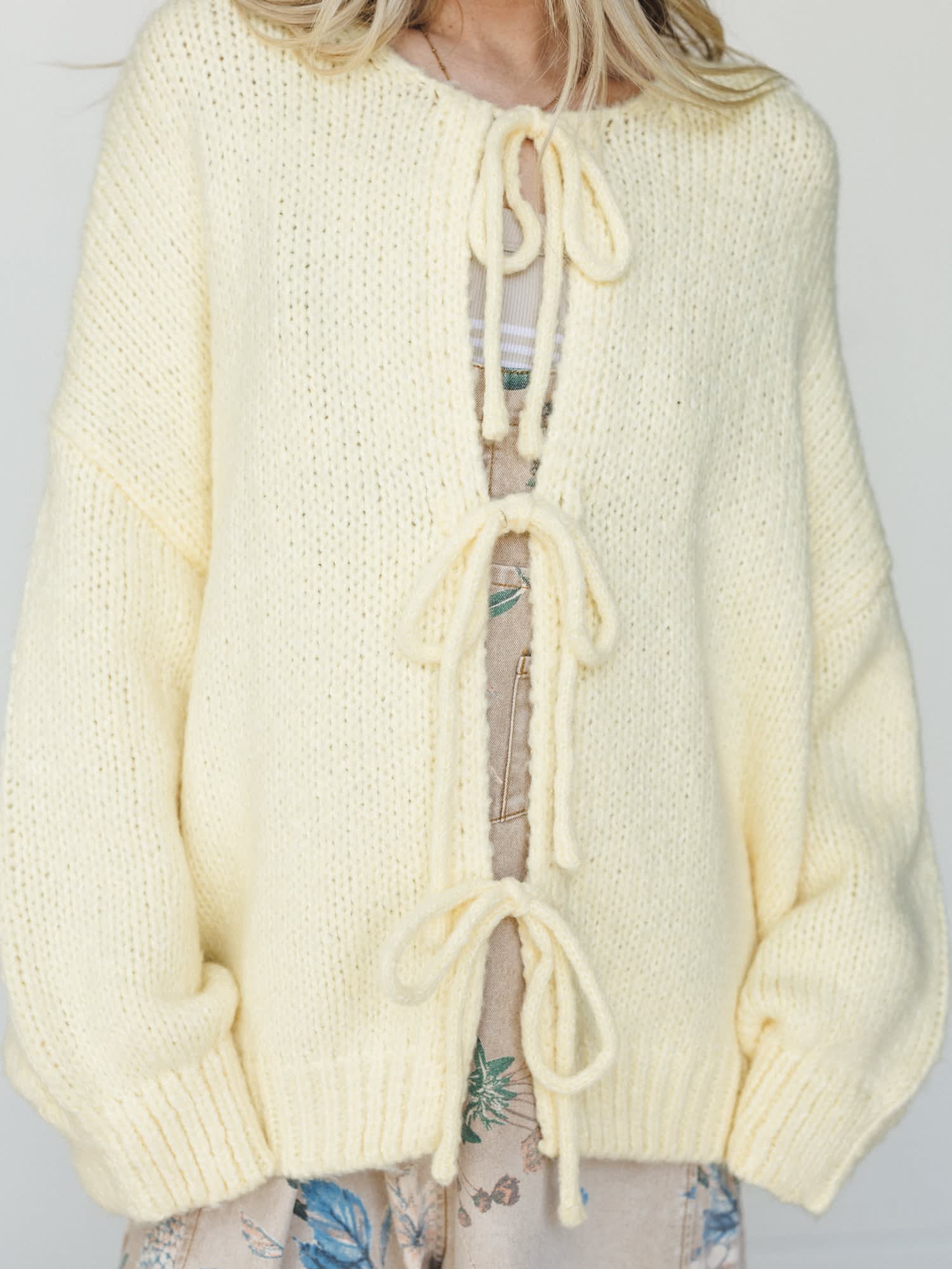 • Oversized chunky knit cardigan in a soft butter yellow with voluminous balloon sleeves and a relaxed, drapey open-front silhouette.