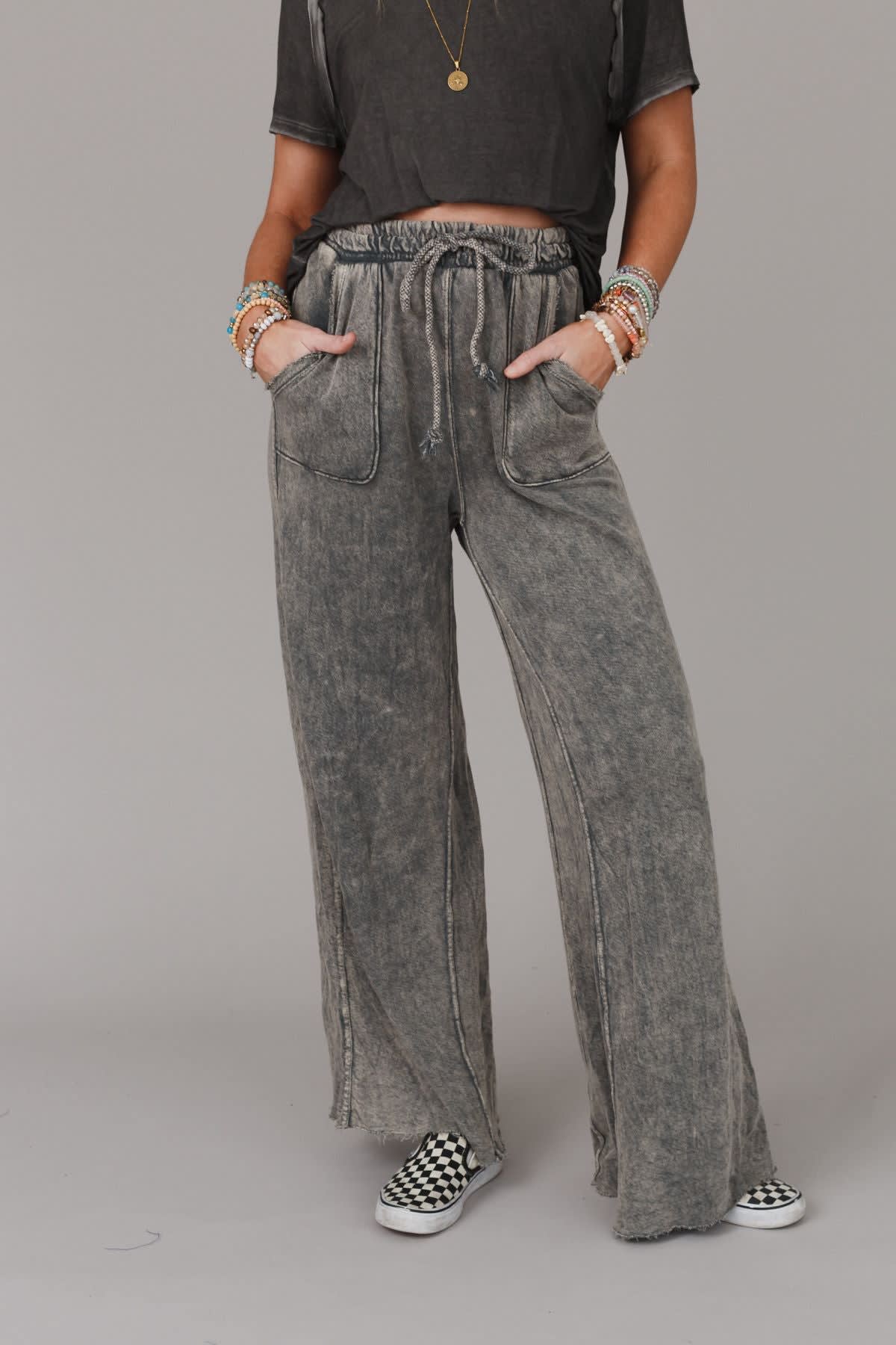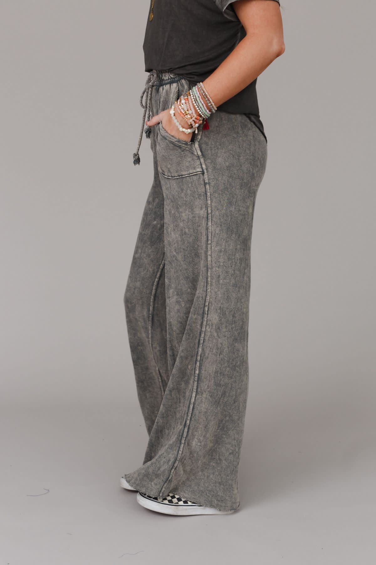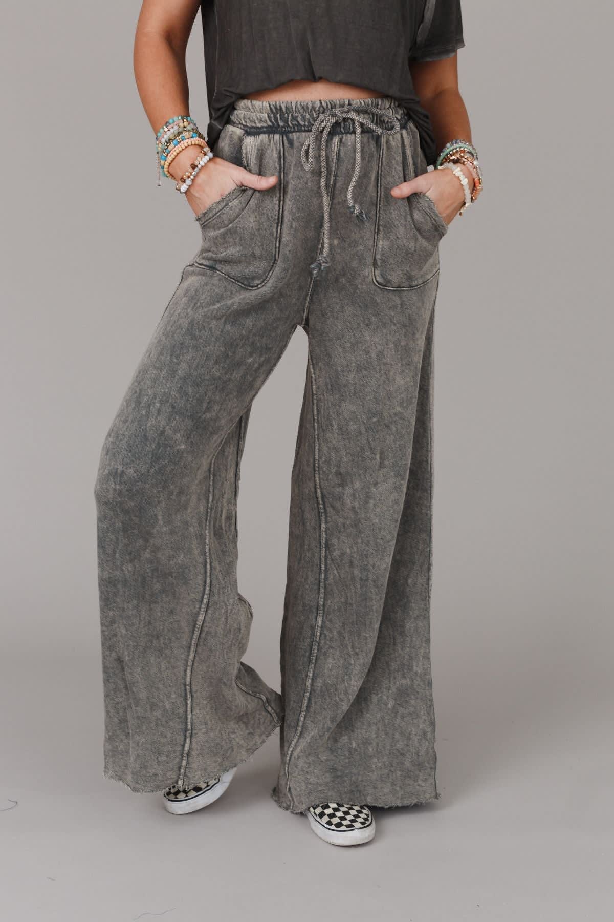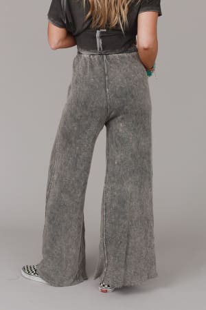 Cute pants that are fun, funky, and boho-comfy too?! “Yes” to a wide-leg silhouette with a draw-string waist in soft French Terry. Vintage fade makes these a casual favorite while visible seams, full length raw-edges, and outline pockets add to the relaxed vibe.