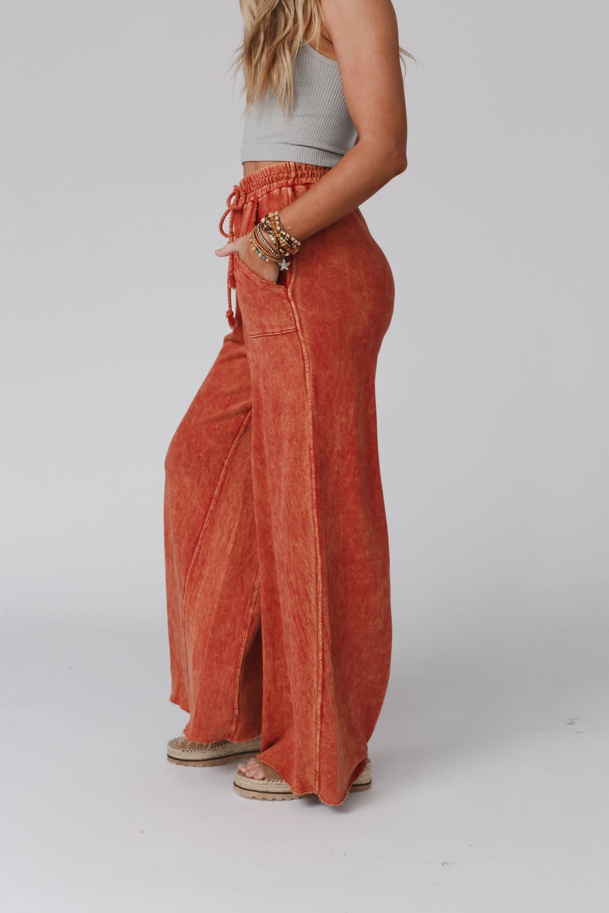 These boho wide leg pants look amazing with baby doll and graphic tees.