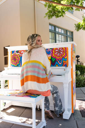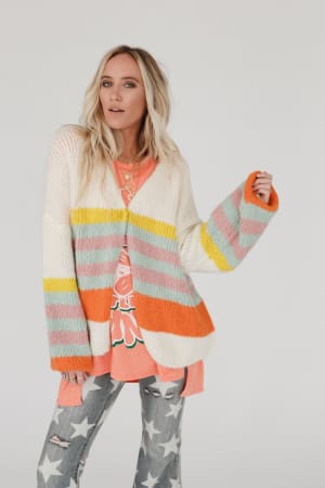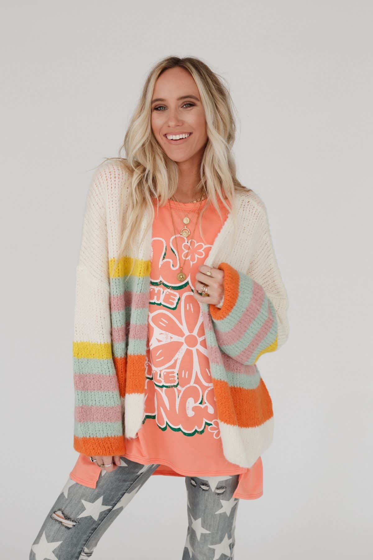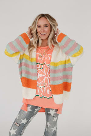 Our Retro Babe Striped Cardigan is the perfect piece to brighten any fall day! It features an oversized silhouette in a soft knit, with multicolored stripes, dropped bishop sleeves, and a single snap closure at the bust. A little bit retro and a whole lot of fun for your wardrobe!