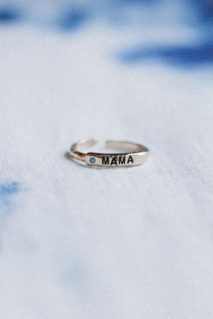- Adjustable “Mama” ring with dainty engraved detail and sky-blue charm