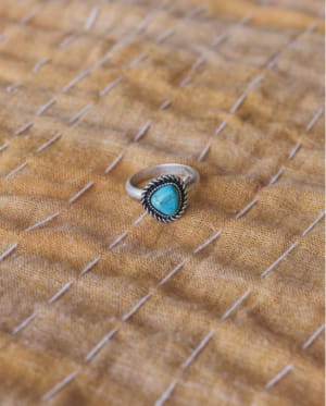 - Trailblazer ring features a teardrop turquoise stone in a rope-edged setting