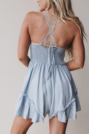 Pair this adorable denim romper with stacked bracelets and brown booties for a night out look.