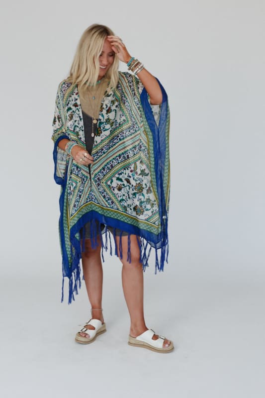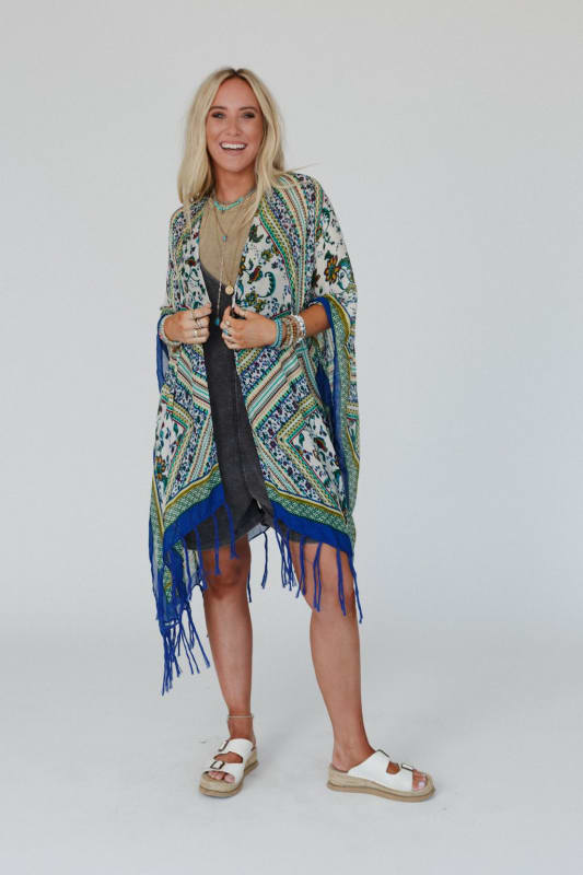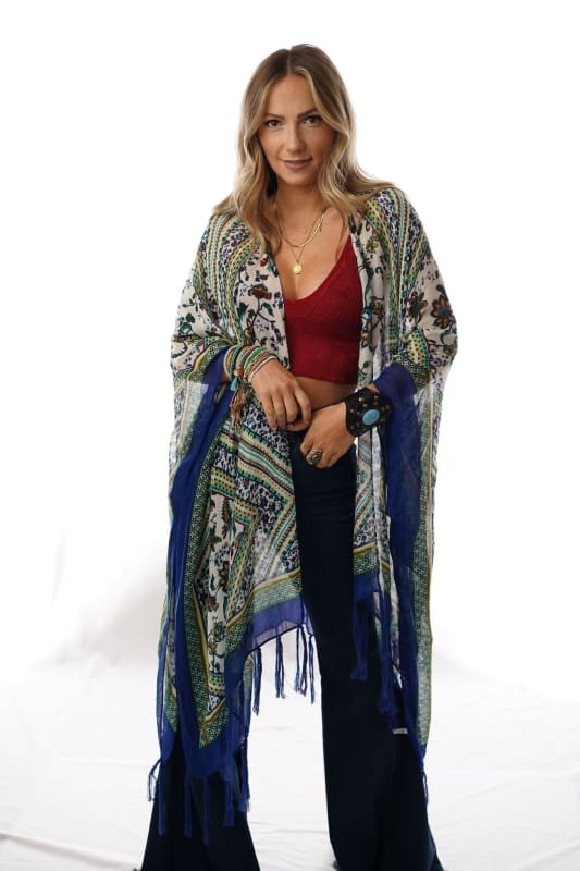 The lightweight Riviera Kimono is gorgeous in this bohemian print with artistic borders, vintage floral, and inviting colors. Inspired tassels adorn the angled knee-length hem, while side slits and wide sleeves give graceful flow to this one-size layer that adds style to every outfit.
