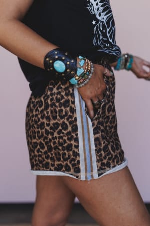 These sporty leopard shorts look amazing with graphic tees and sneakers for an edgy casual look.