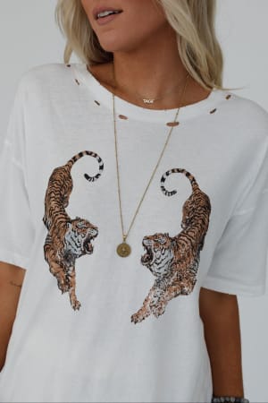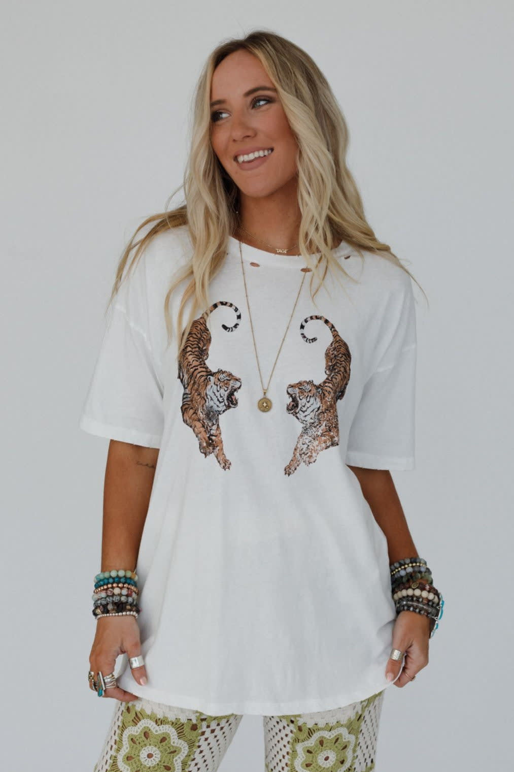 Take a walk on the wild side in this boho graphic tee featuring twin tigers and a relaxed fit.