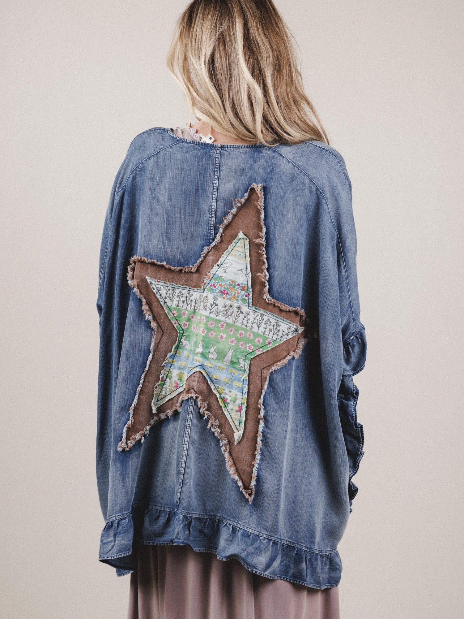 Bring magic to your everyday look with the Wishing Star edition of our fan-favorite Robbie Denim Jacket. This dreamy denim layer blends effortless boho vibes with a touch of fairytale charm, thanks to its oversized star appliqué that’s stitched with delicate florals, woodland motifs, and frayed edges for that perfectly lived-in feel.