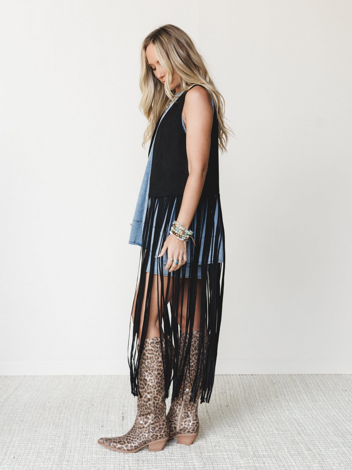 - Soft chambray fabric offers breathable comfort while the fringe vest adds flowing movement and festival-ready drama.
