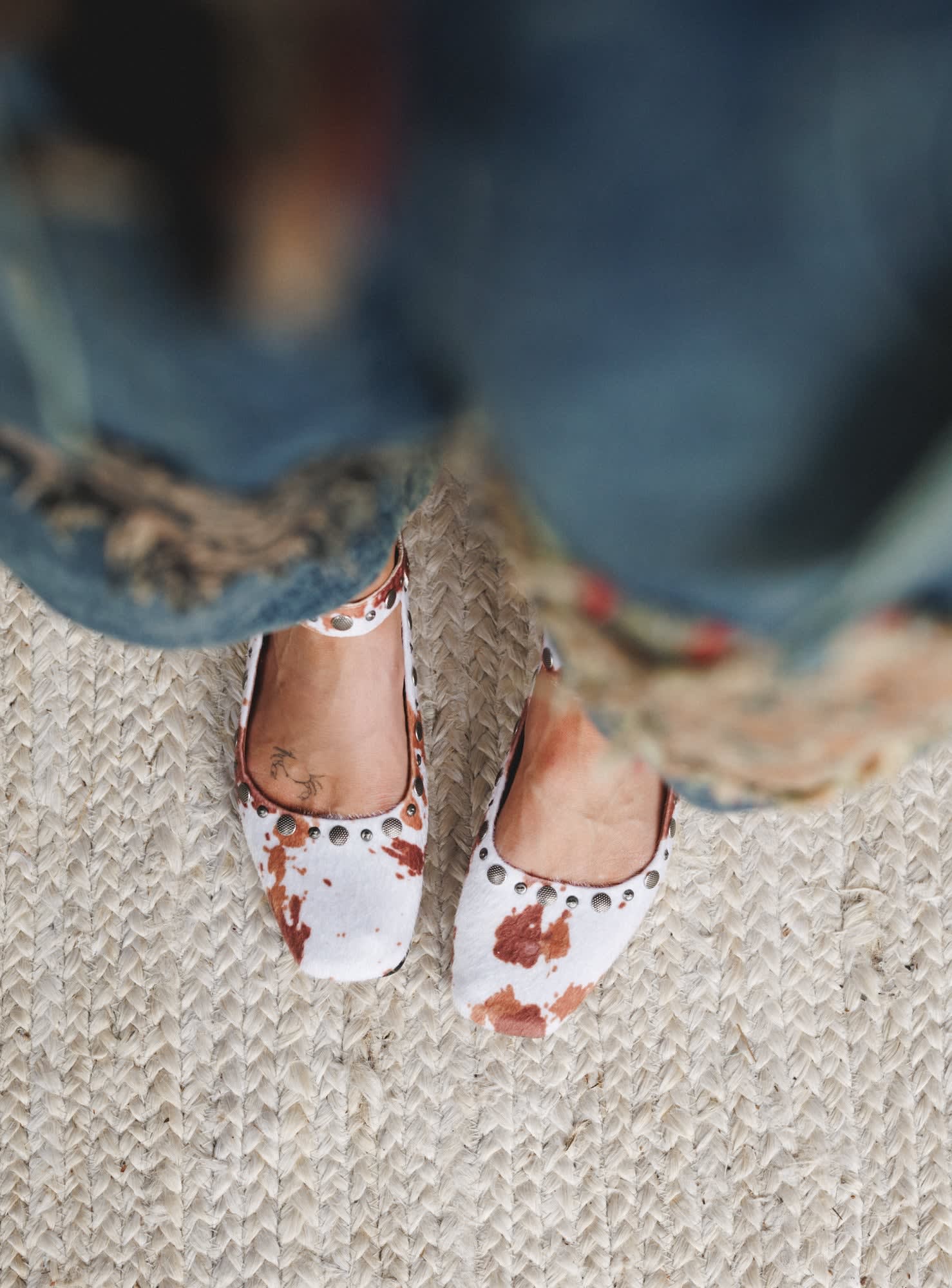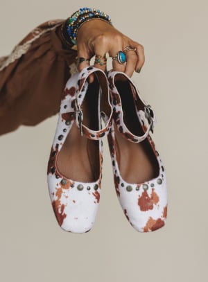 Equal parts wild and wearable—these cow print ballet flats bring a rebellious twist to a timeless silhouette. With edgy stud accents and eye-catching patterning, the Rockstar Ballet Flats are your go-to statement shoes when you want comfort without blending in.
