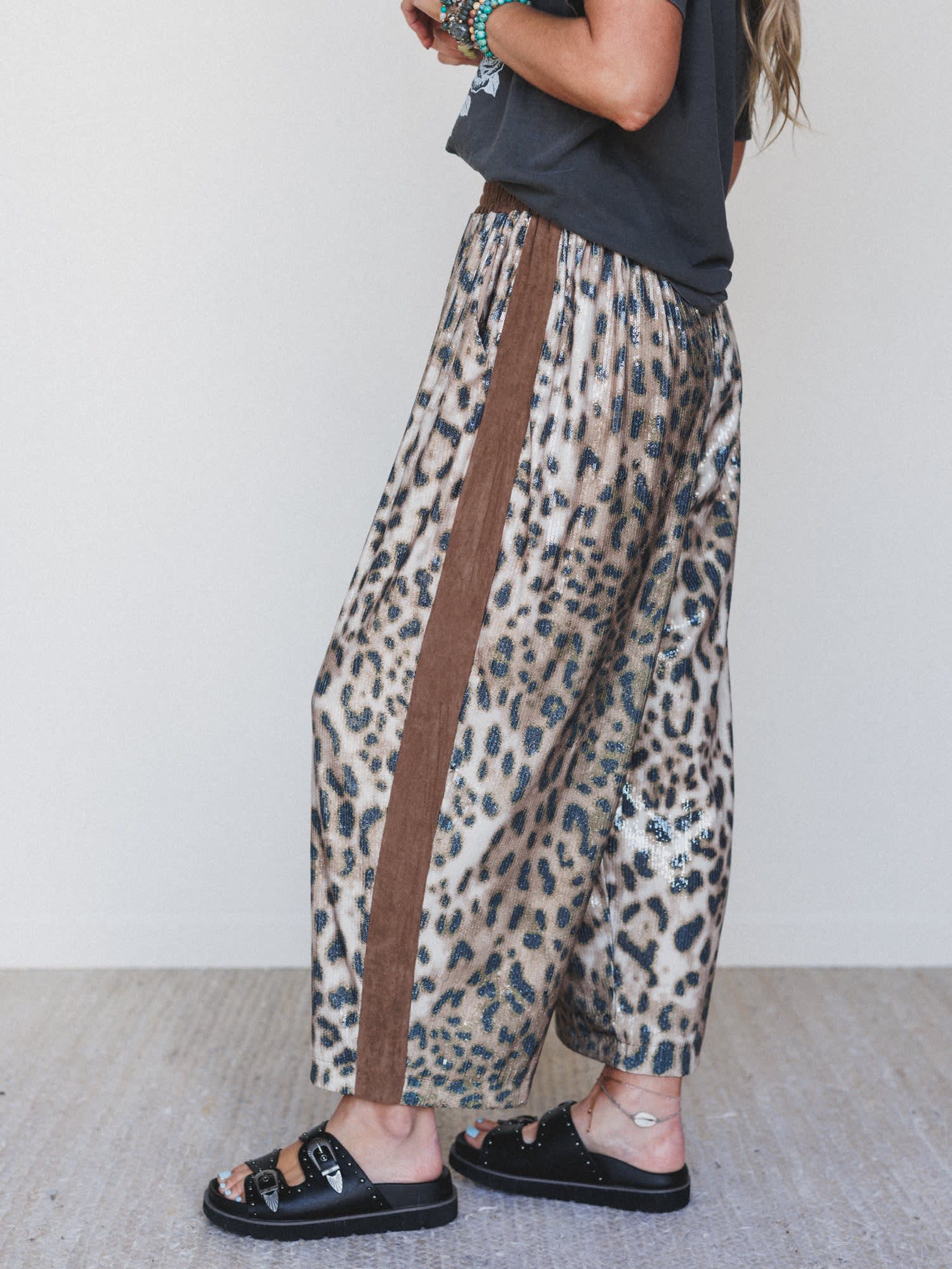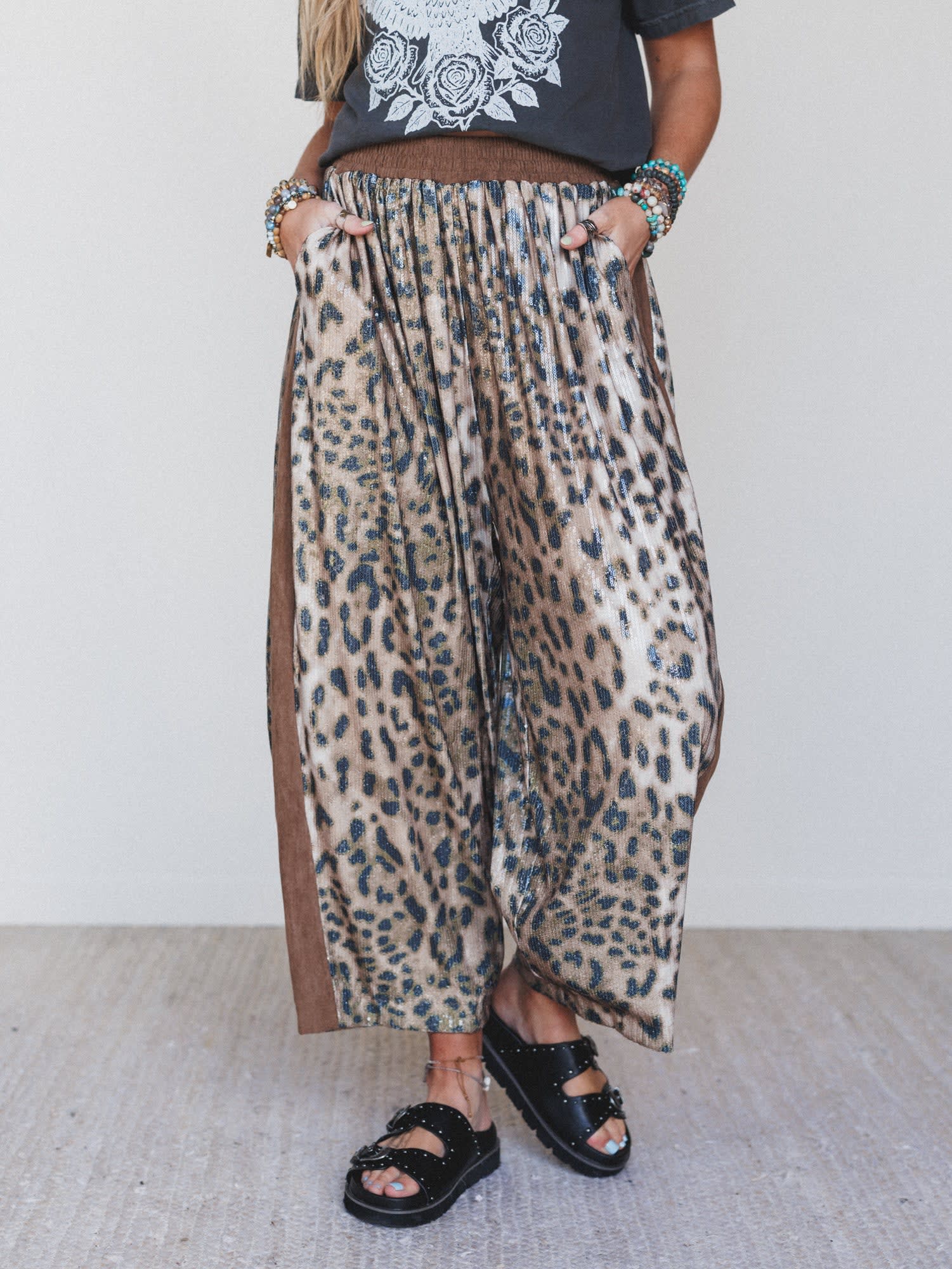 - Savannah Rise Pants: Wide-leg shimmer pants with an elastic waistband, side pockets, and velvet side panels for extra dimension and movement