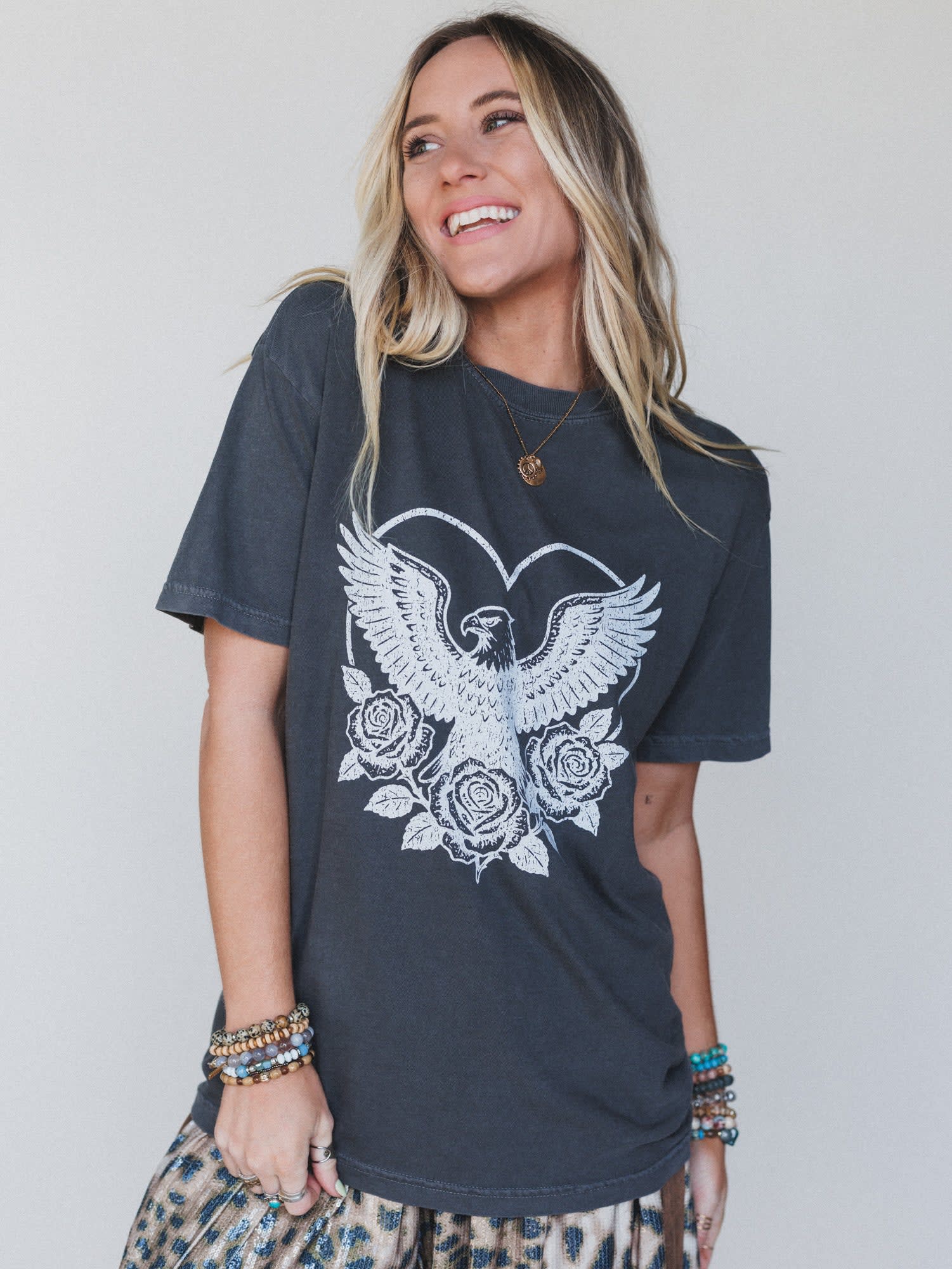 - Soaring Romance Graphic Tee: Soft-washed charcoal tee with a hand-drawn eagle + rose graphic and relaxed silhouette for that vintage look and feel