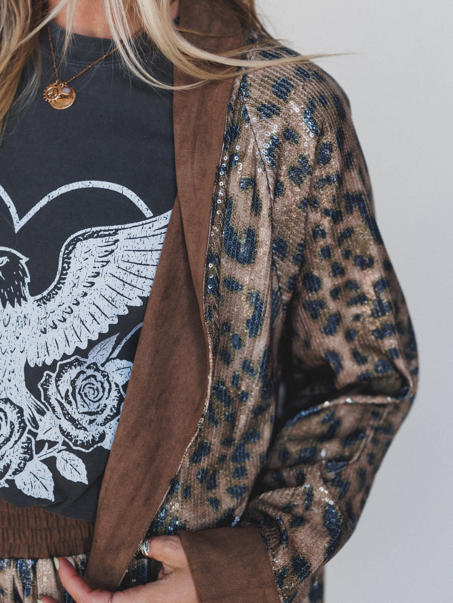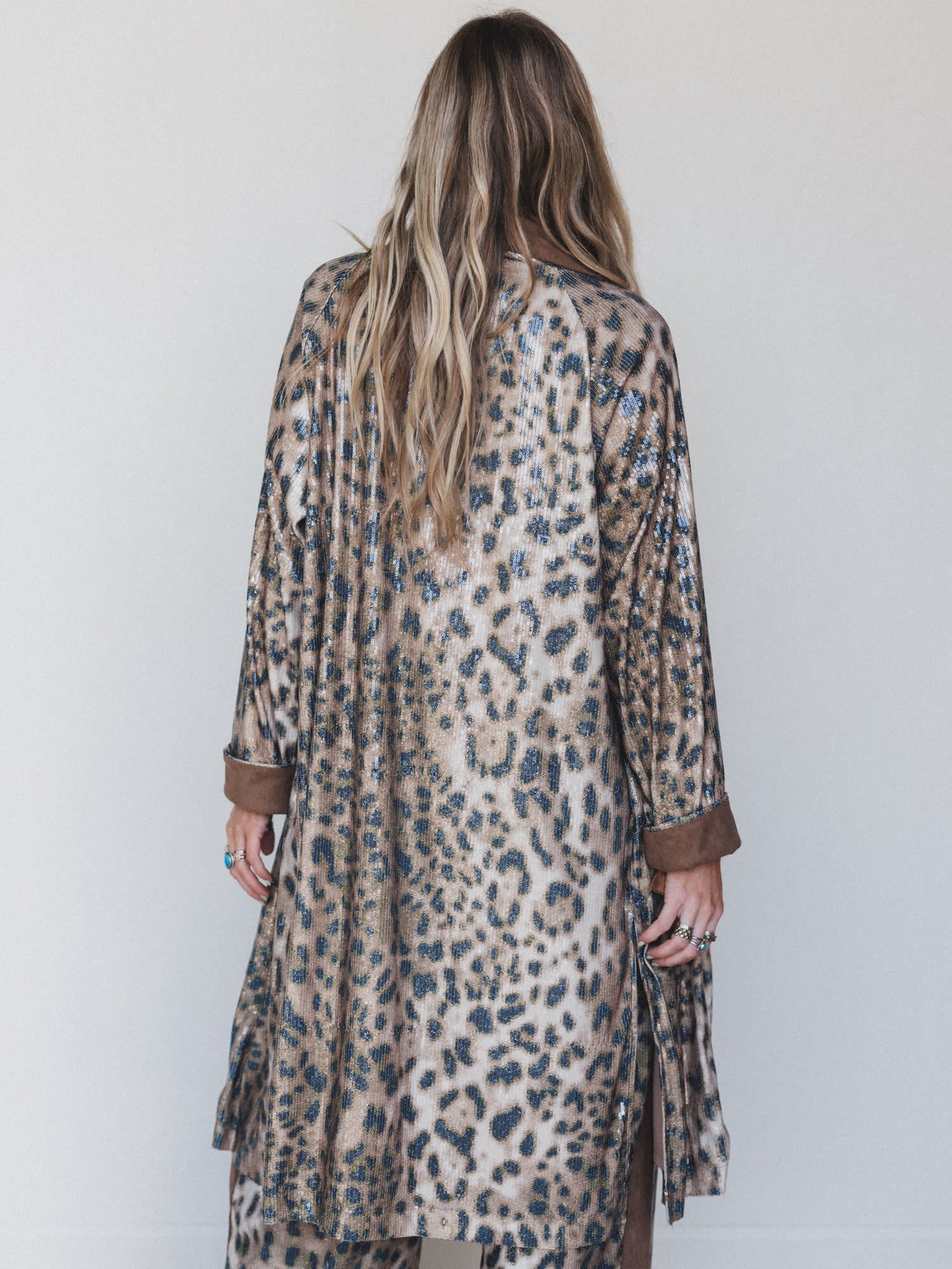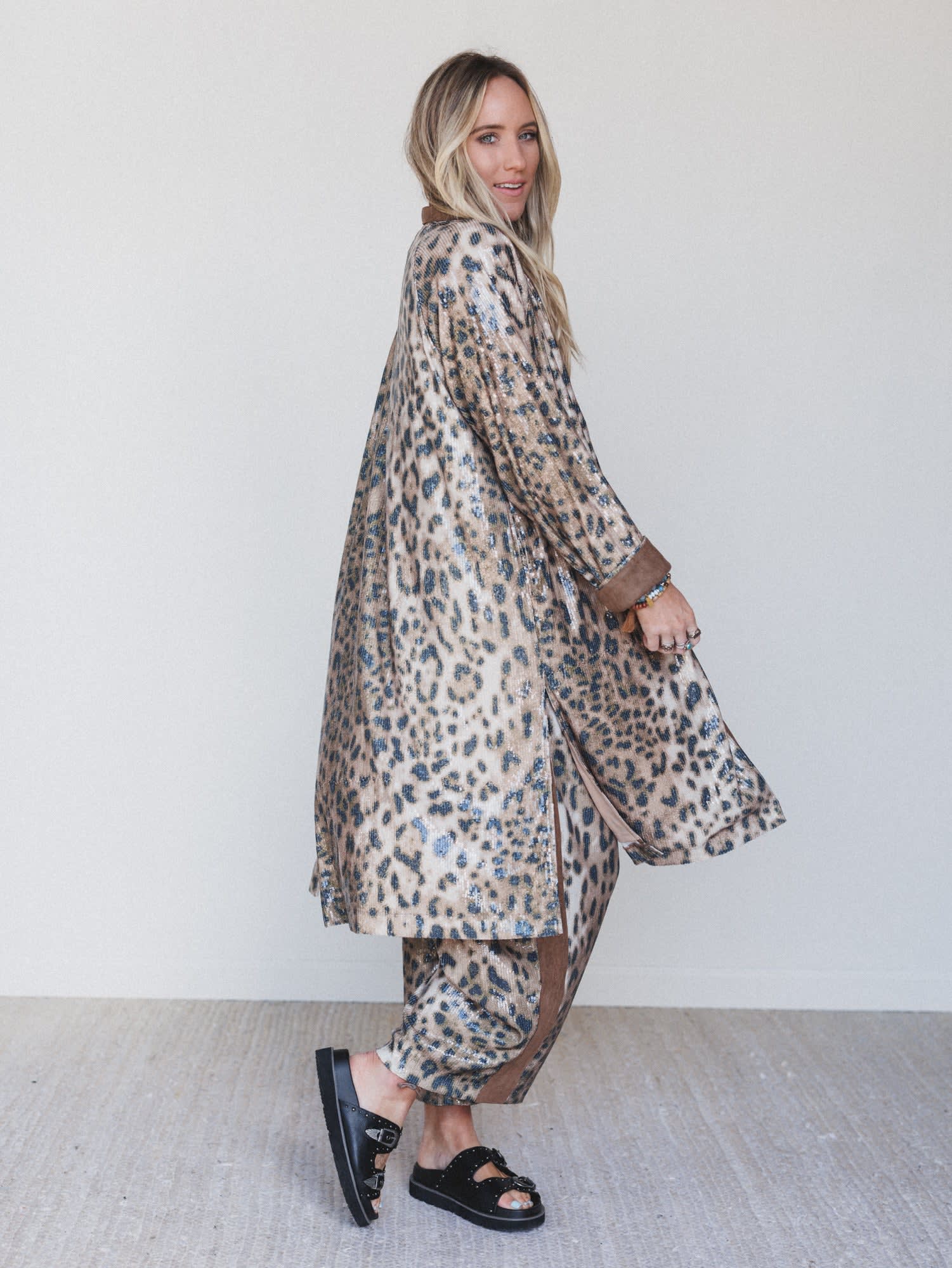 - Hillcat Muse Jacket: Longline duster-style jacket with a bold leopard print, soft suede contrast collar and cuffs, and a relaxed fit that adds instant drama