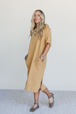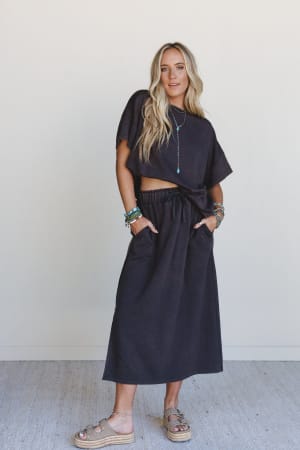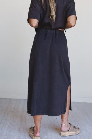 - Midi-length lounge skirt with drawstring waist, big patch pockets, and side slits