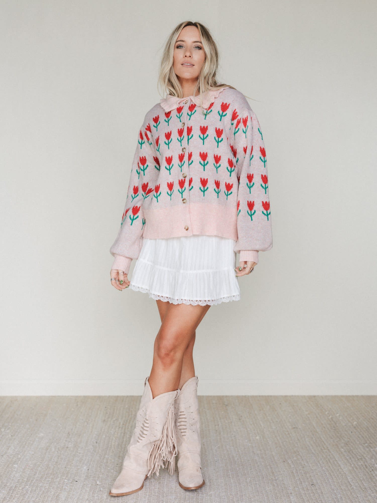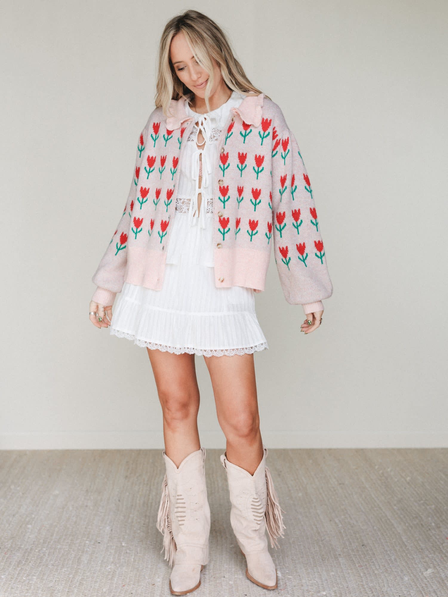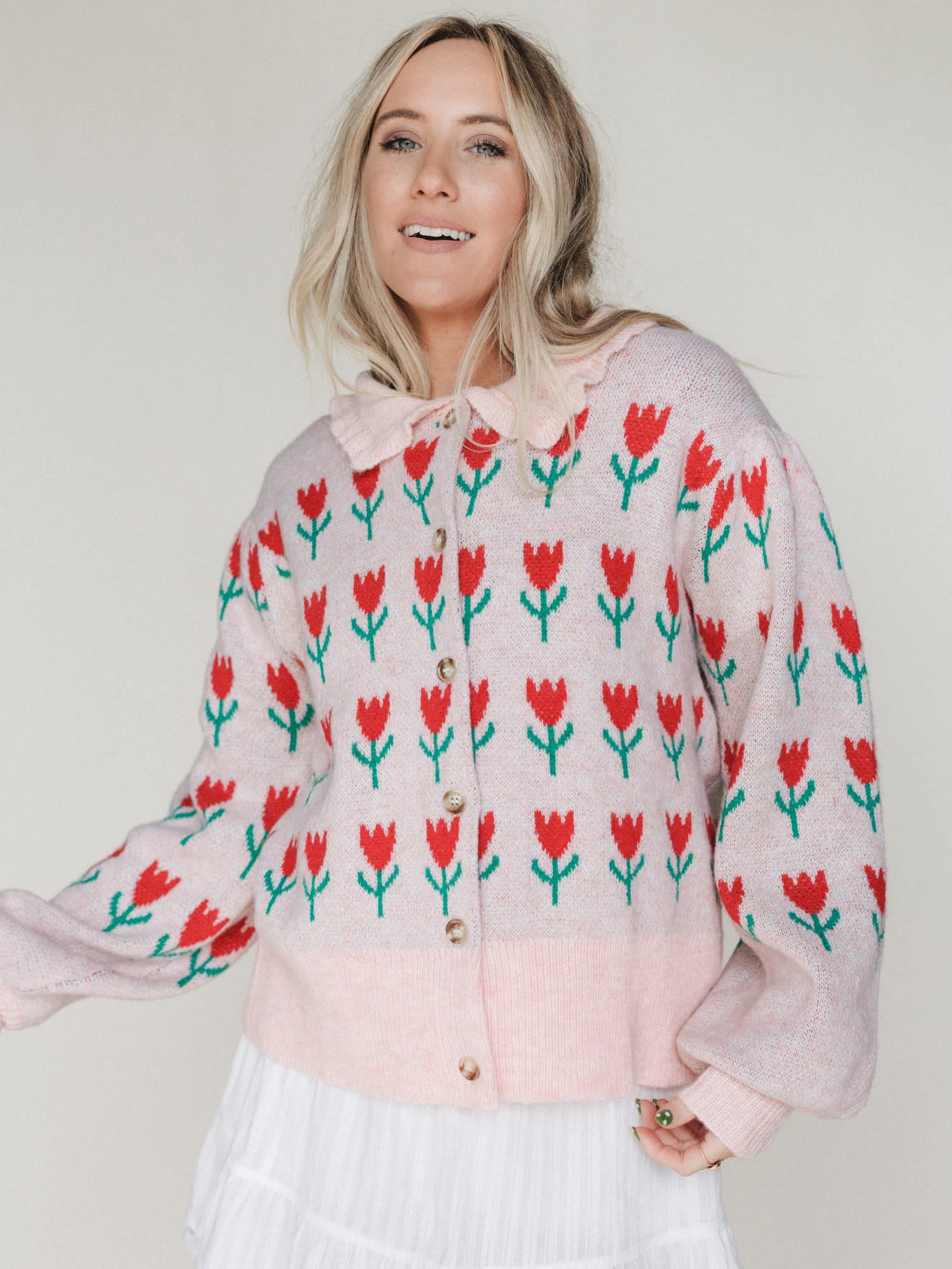 - The Sweet Petals Cardigan adds a cozy layer in blush pink with playful red tulip knit details and a relaxed button-front fit.