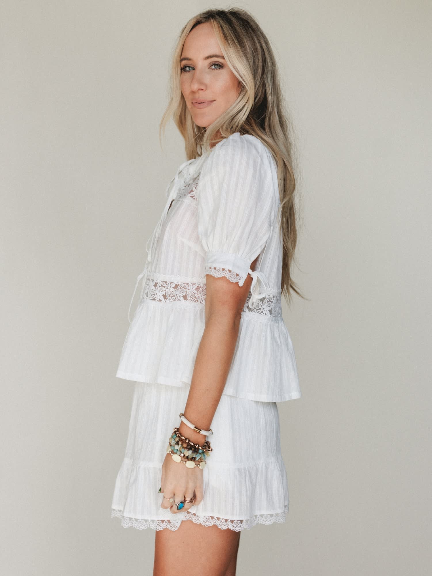 - The Ingrid Two Piece Set features a soft off white lace top and matching tiered mini skirt with delicate trim and airy texture.