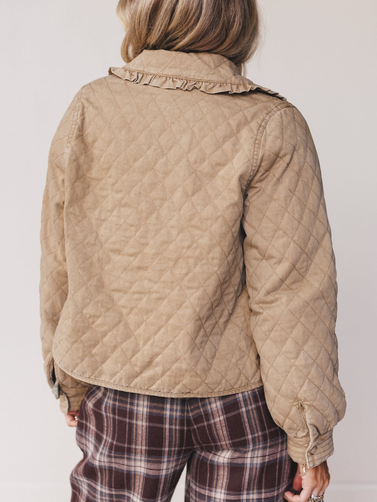 Channel countryside charm with the Rowan Cottage Quilted Jacket, a timeless layer crafted in a cozy diamond-stitched texture. Designed with soft structure and subtle femininity, this jacket features a delicate ruffle collar, adjustable waist ties, and oversized patch pockets for a blend of utility and sweetness. Its warm, neutral tone makes it endlessly pairable β€” whether you're layering over florals or flannel.