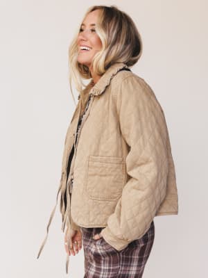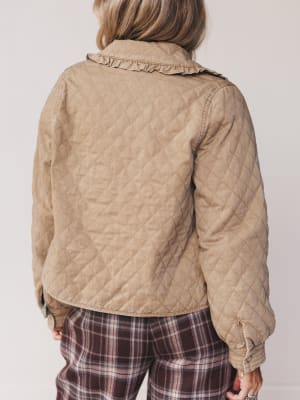 Channel countryside charm with the Rowan Cottage Quilted Jacket, a timeless layer crafted in a cozy diamond-stitched texture. Designed with soft structure and subtle femininity, this jacket features a delicate ruffle collar, adjustable waist ties, and oversized patch pockets for a blend of utility and sweetness. Its warm, neutral tone makes it endlessly pairable β whether you're layering over florals or flannel.