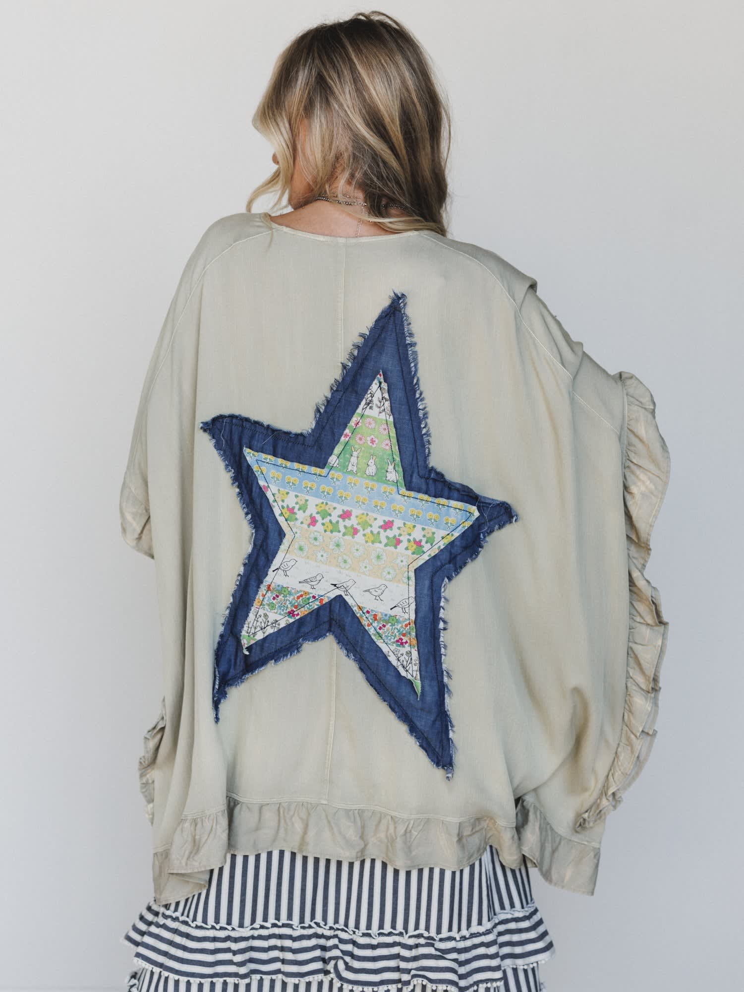 • Oversized silhouette with statement patchwork star detail on the back
