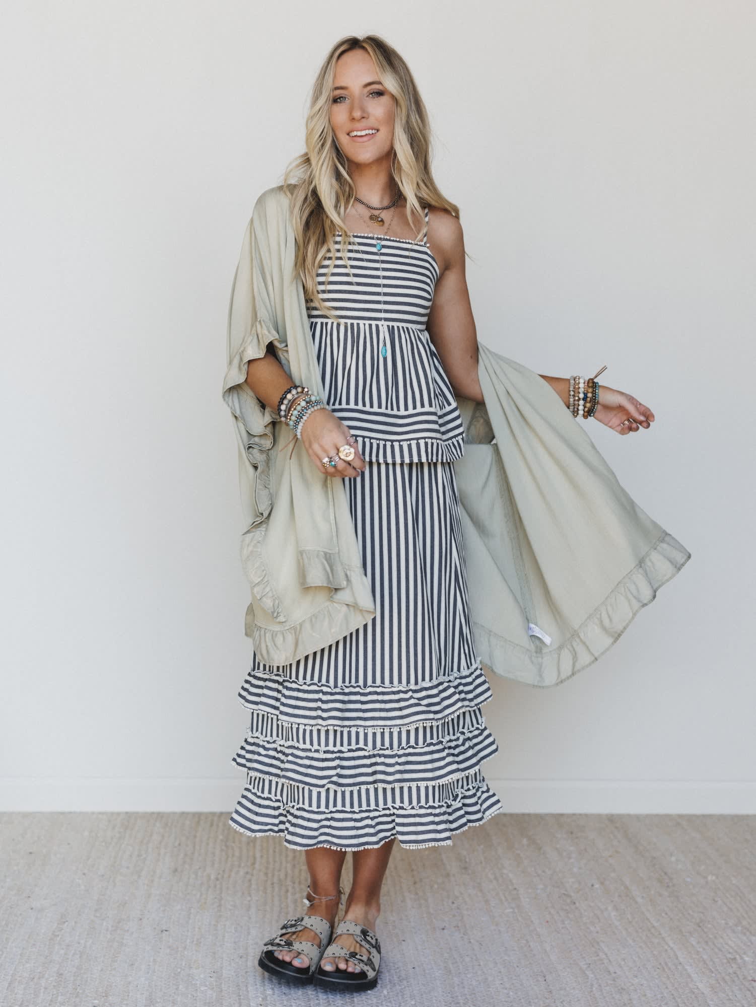 Easy, breezy, and full of charm — this layered look was made for sunny days and cool evenings. Whether you’re headed to brunch, a weekend market, or planning what to wear to a country concert, this effortless combo brings soft boho vibes with a little star-powered statement.