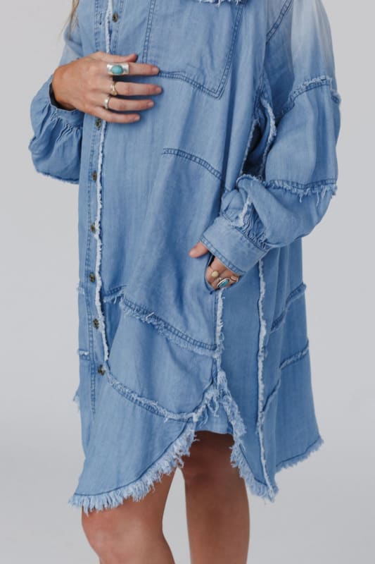 - This boho denim dress is oversized for a laid-back look and pairs perfectly with tall boots.