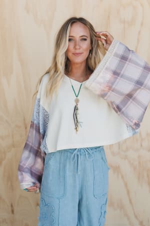 • This patchwork pullover is a super cute layer you can easily pair with wide leg jeans and sneakers.