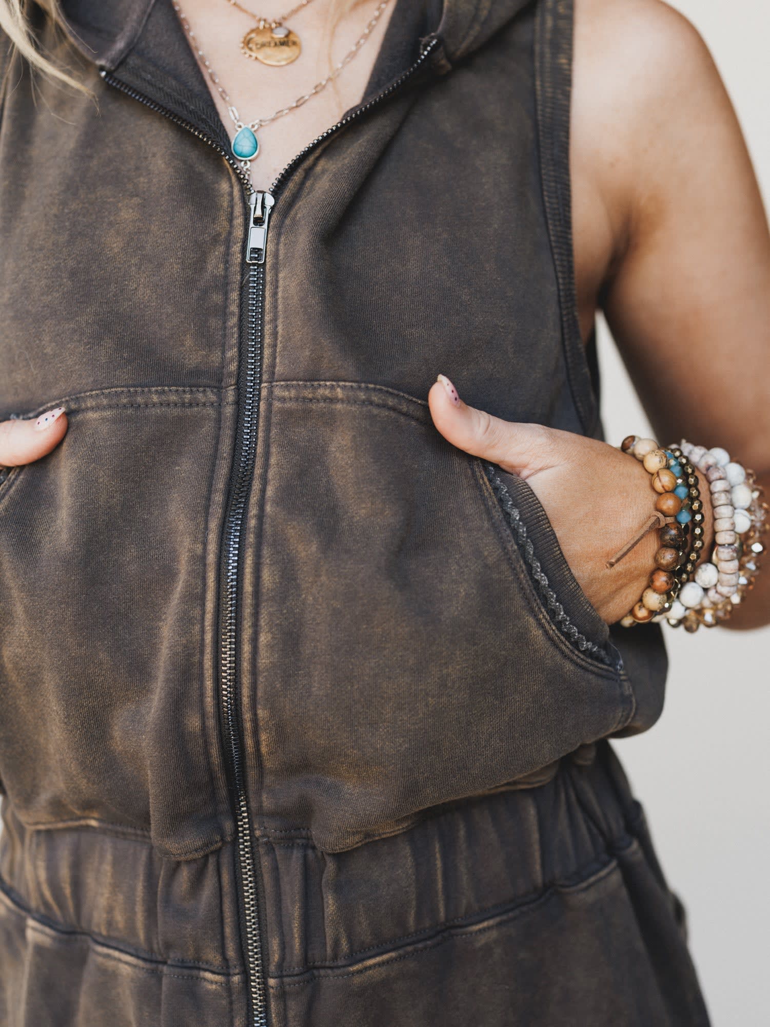 This is the one-and-done outfit you’ll reach for when you’re figuring out what to wear on a road trip or need an easy weekend outfit that still looks styled. With its vintage wash and relaxed fit, this hooded jumpsuit gives you laid-back comfort with a cool-girl edge.