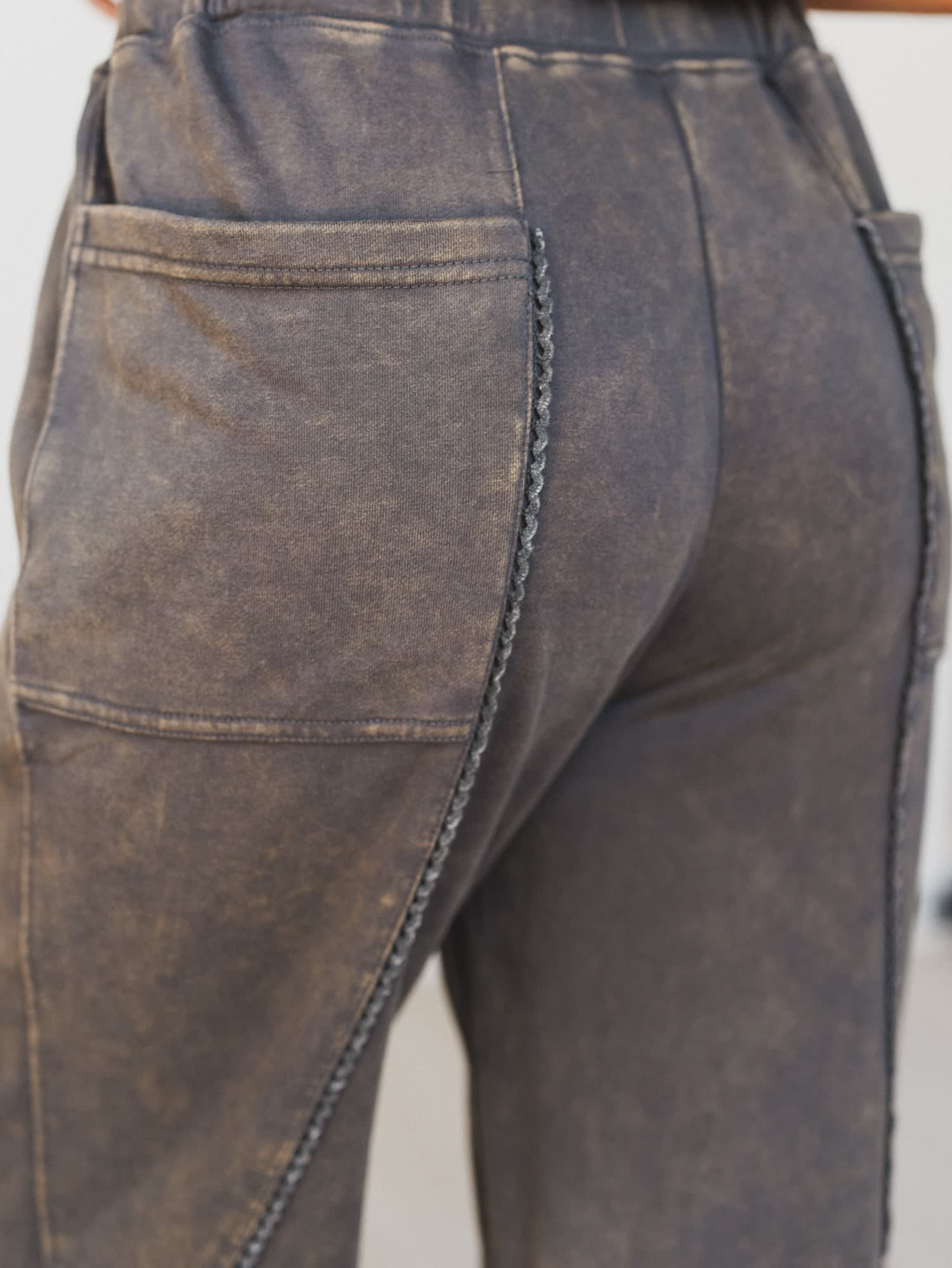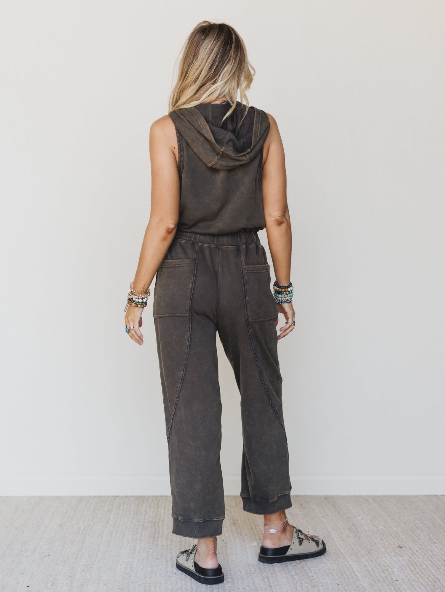 • Washed charcoal sleeveless jumpsuit with a soft, lived-in mineral wash finish