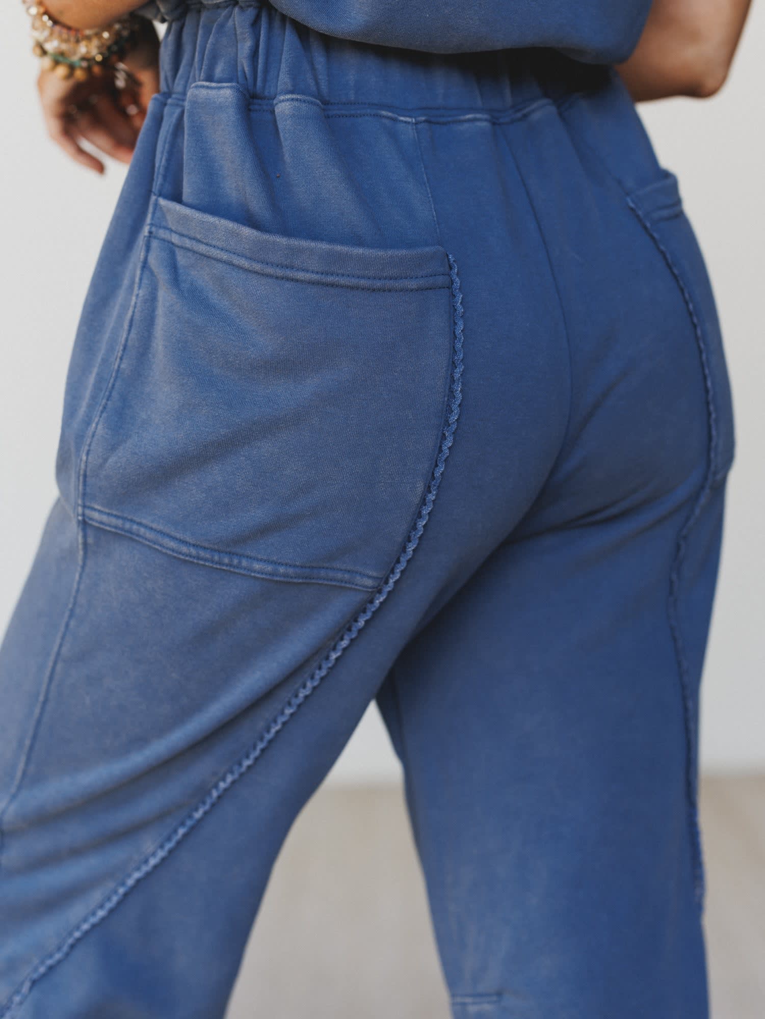 - Denim blue sleeveless jumpsuit with a soft, lived-in mineral wash finish