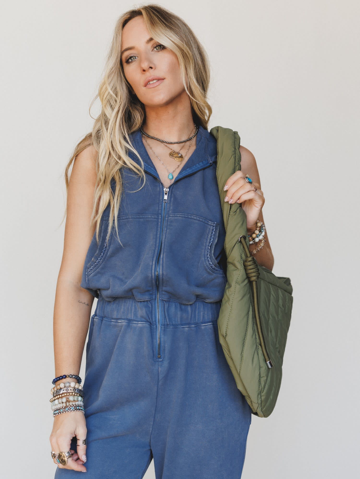 This is the one-and-done outfit you’ll reach for when you’re figuring out what to wear on a road trip or need an easy weekend outfit that still looks styled. With its vintage wash and relaxed fit, this hooded jumpsuit gives you laid-back comfort with a cool-girl edge.