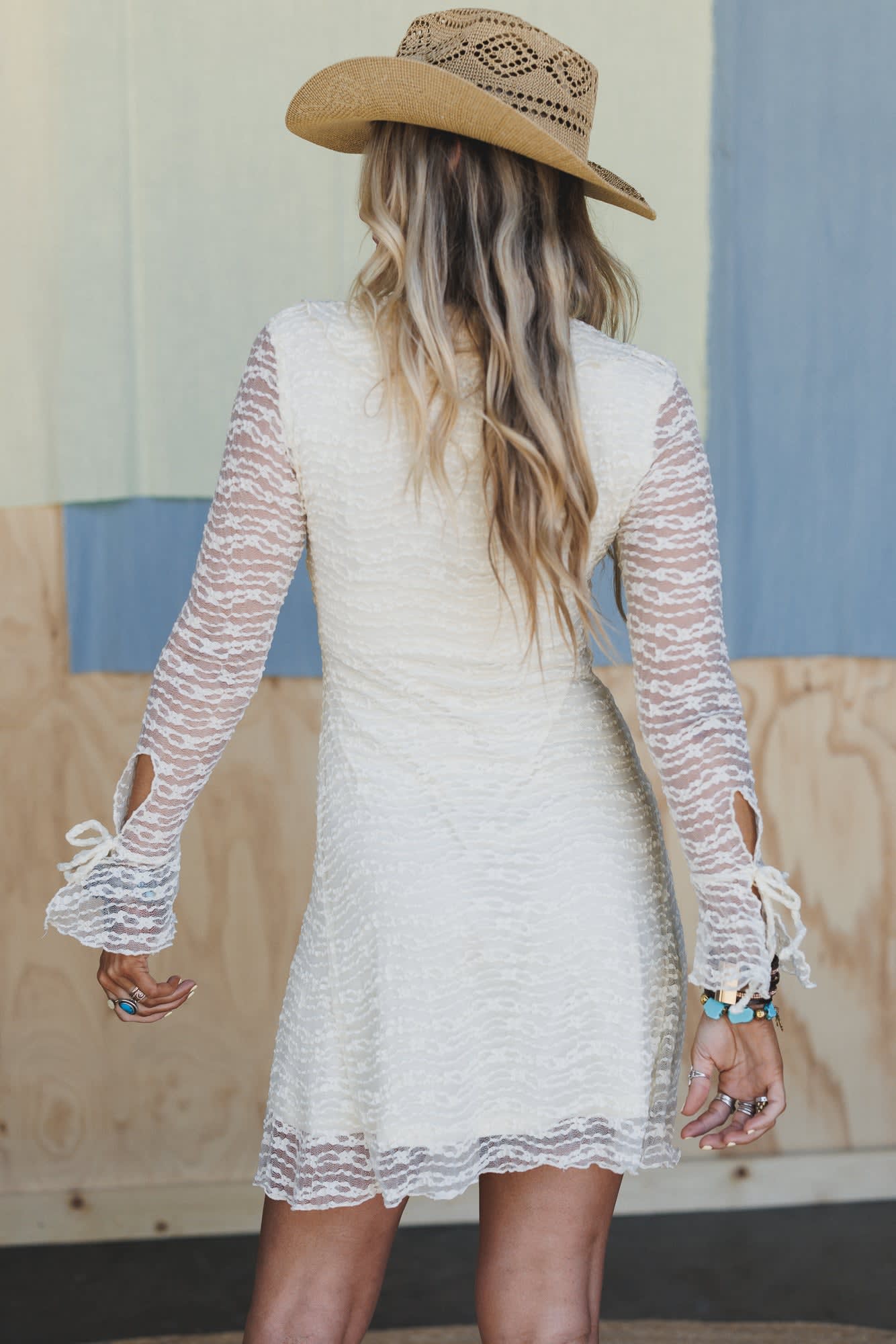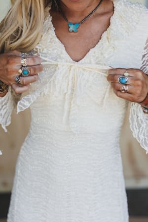 This stunning white lace dress makes for an incredible boho bridal look or dress it down with a denim jacket.