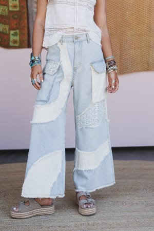 These patchwork wide leg jeans pair perfectly with a graphic tee and sneakers for an elevated casual look.