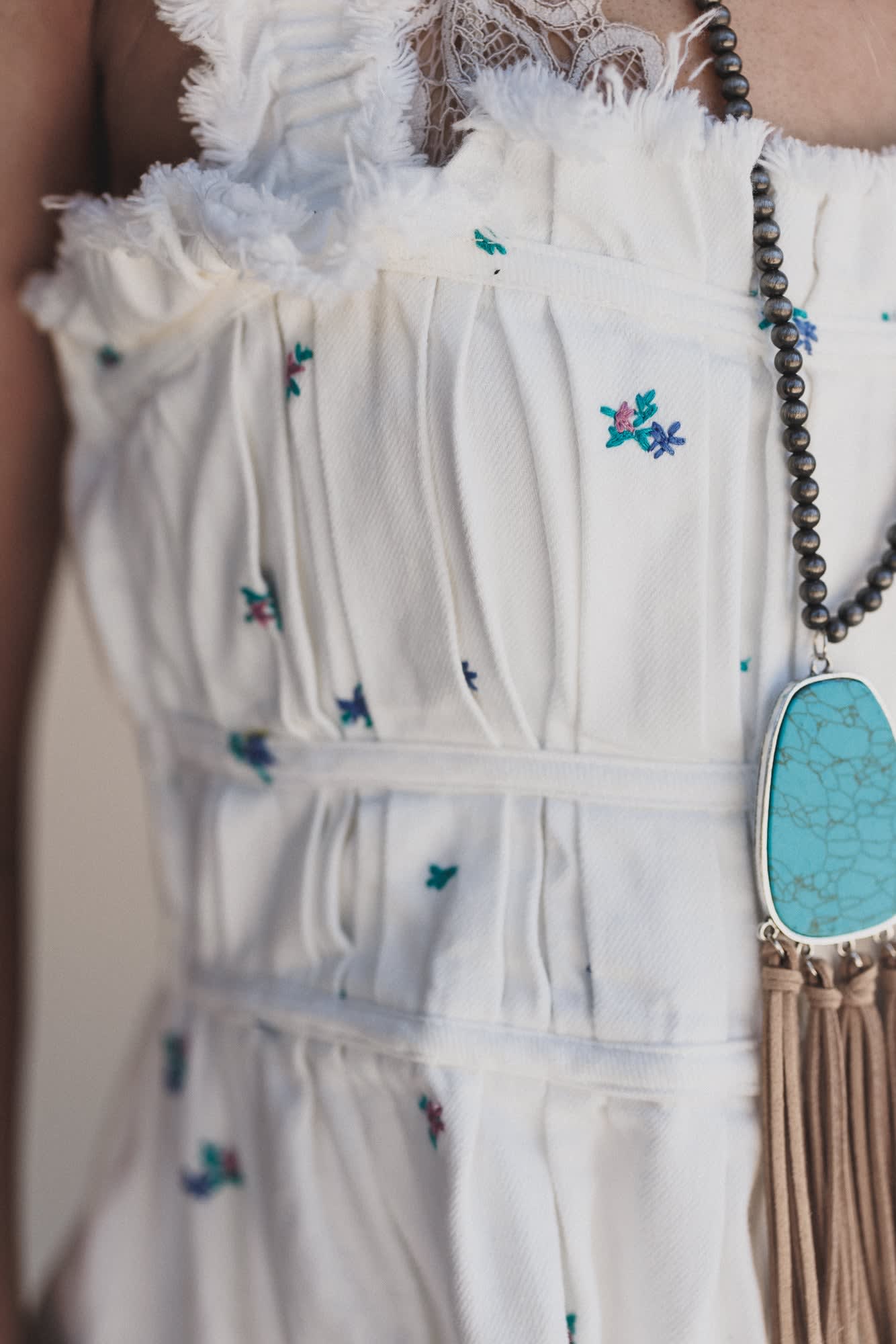 Playful and sweet, this off-white romper is blooming with embroidered floral charm. Perfect for sunny adventures and market days.