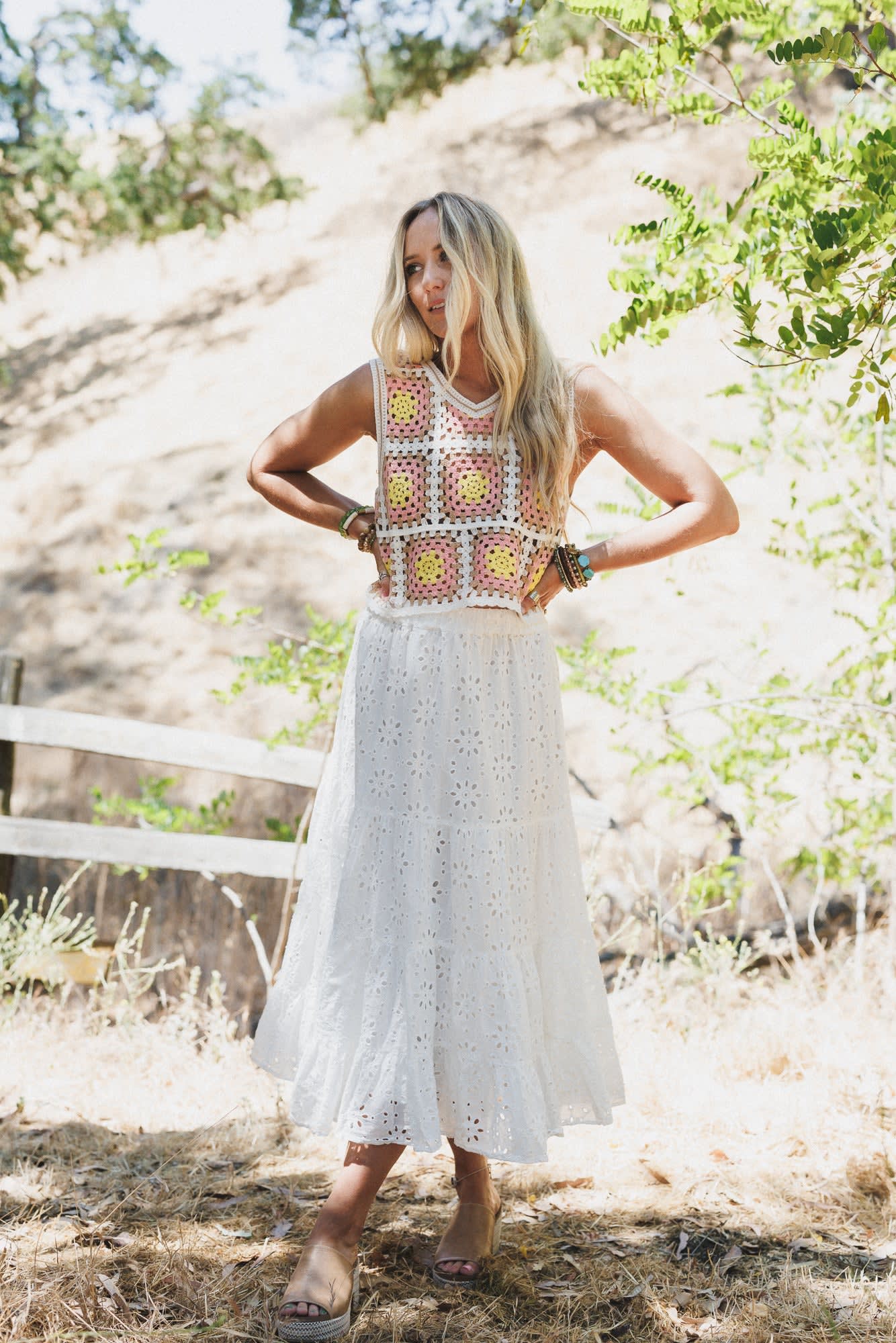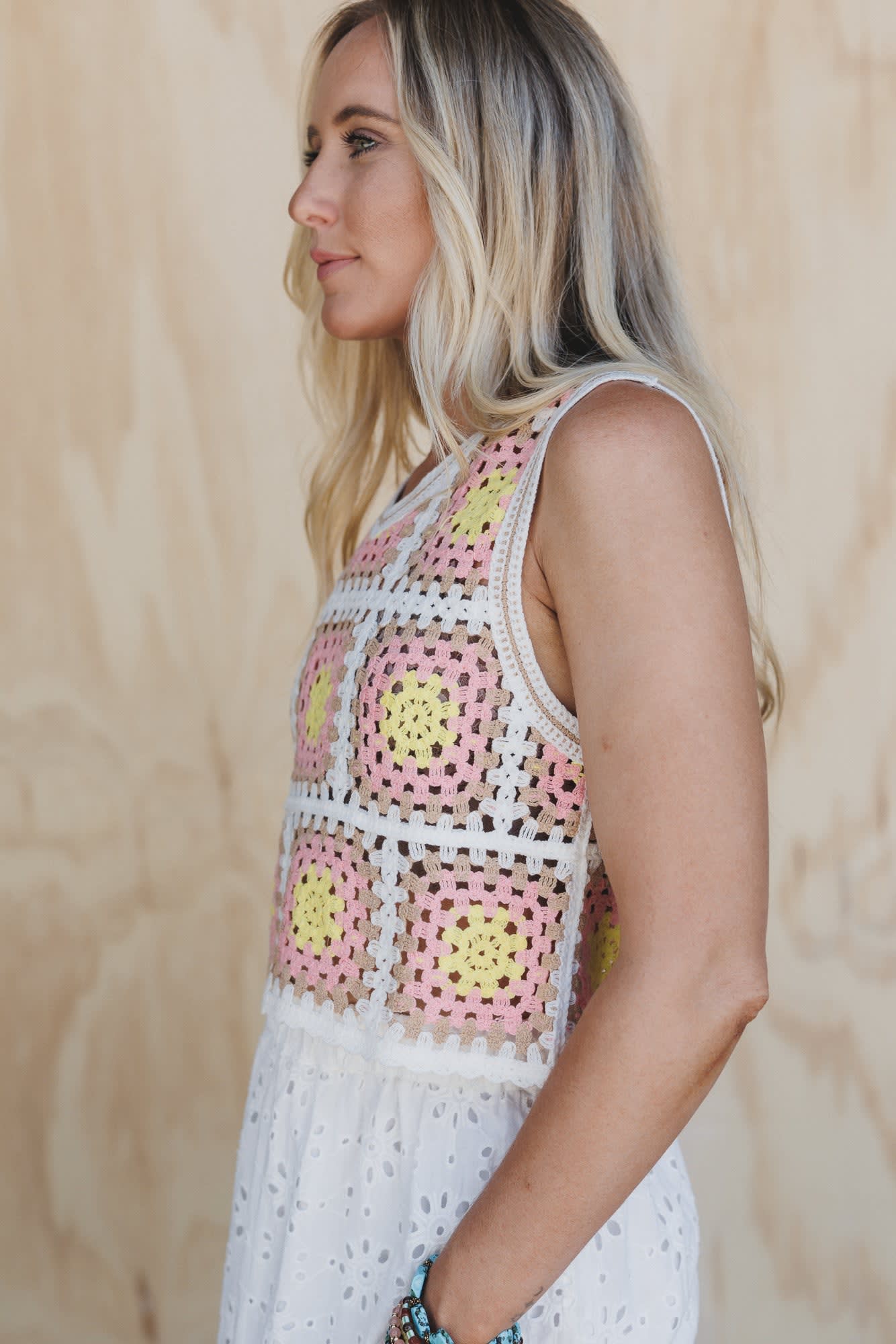 This crochet top pairs effortlessly with crochet pants or bell bottom jeans for a retro look.