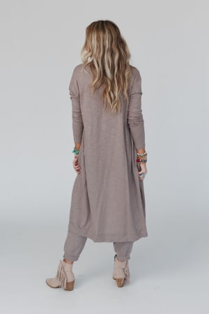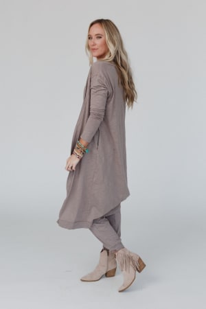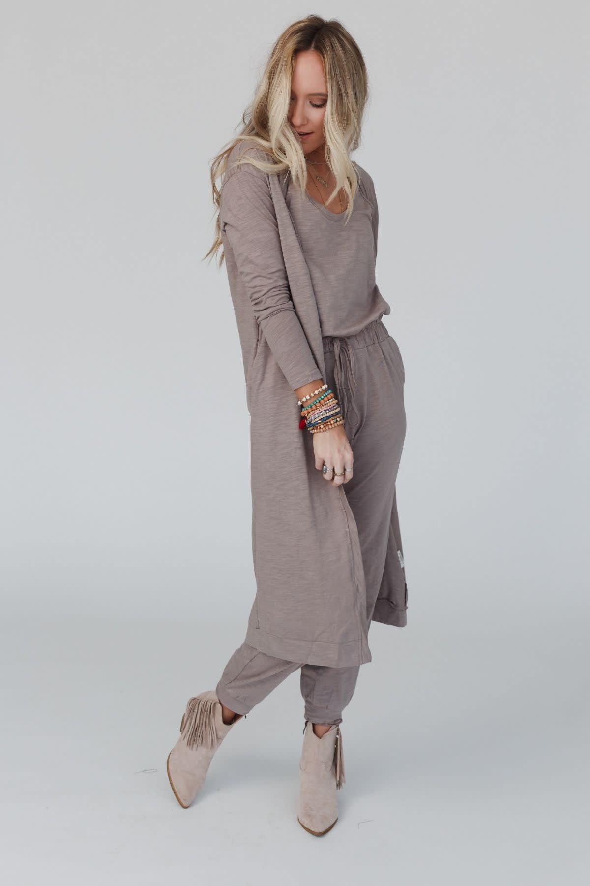 Wear this boho jumpsuit and duster set for a cozy night in or dress it up with jewelry and heels.