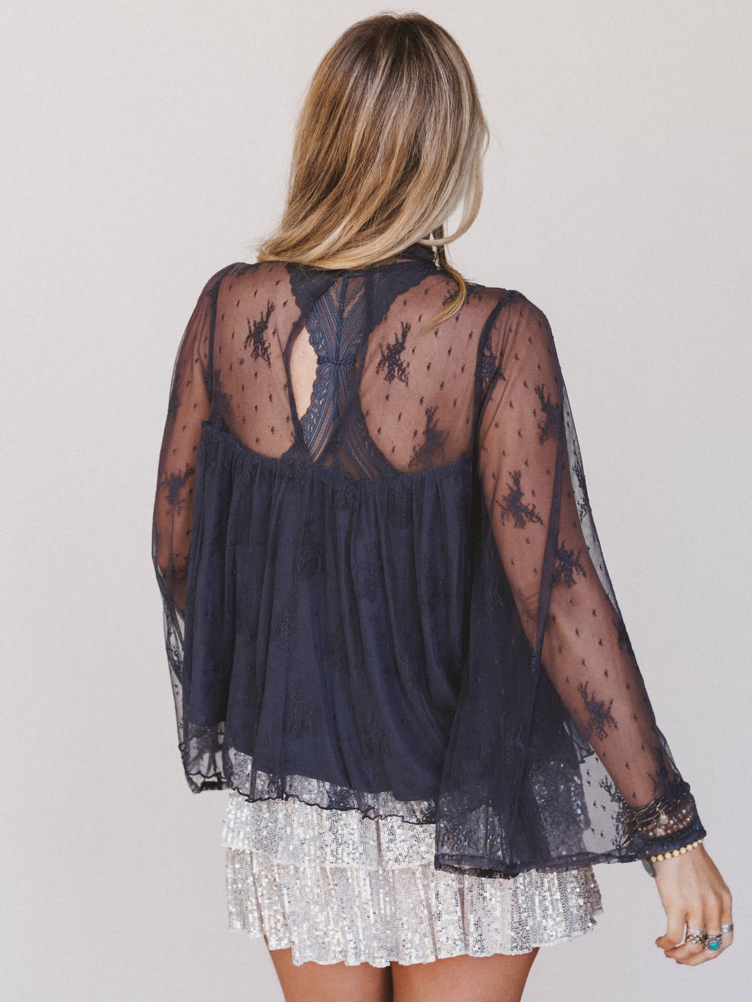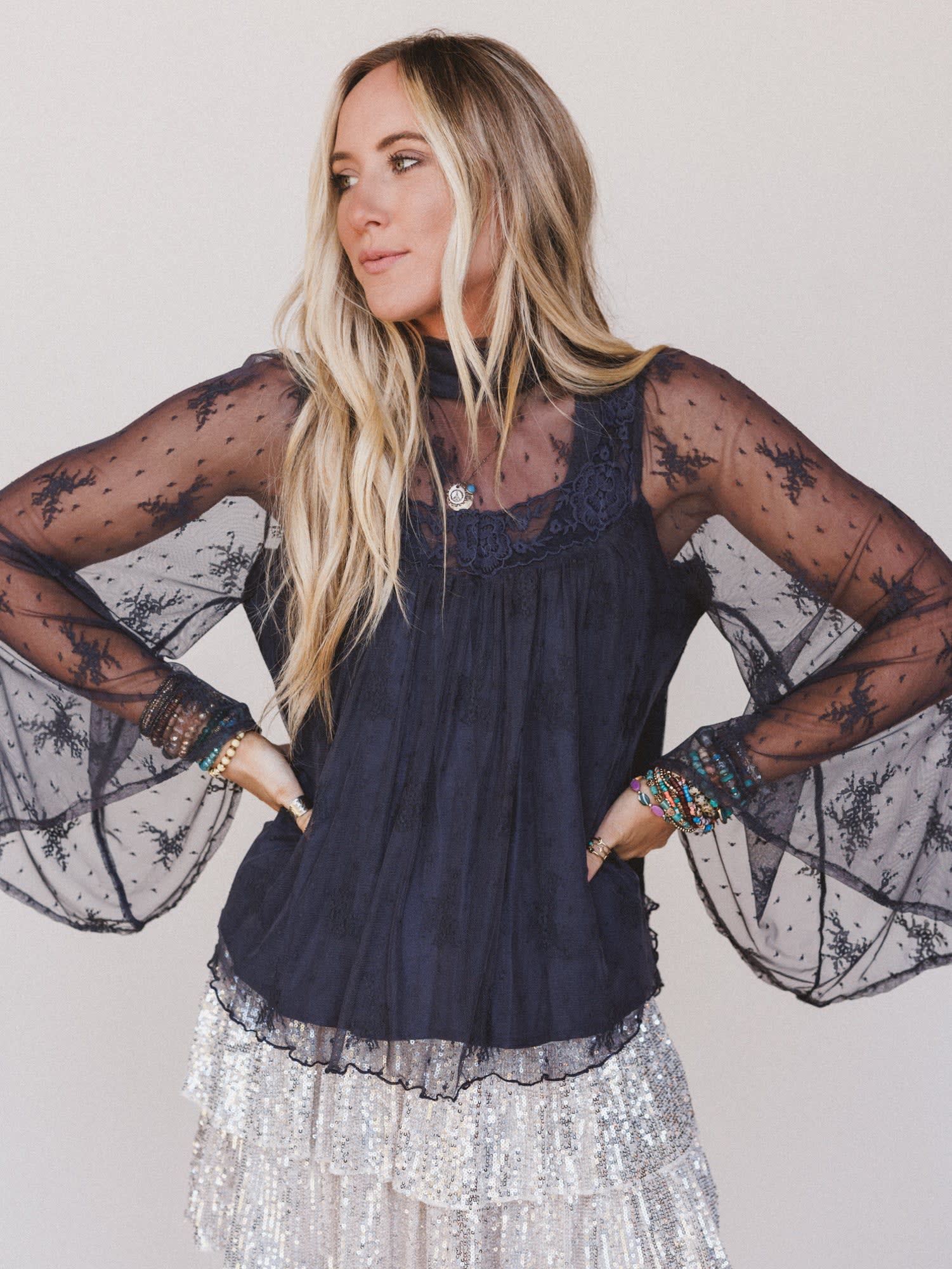 - Lace Horizon Top: A sheer navy blouse with fluttery bell sleeves and delicate embroidery. Softly structured with a mock neck and scalloped lace detail, it layers beautifully over camis or bralettes.