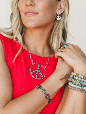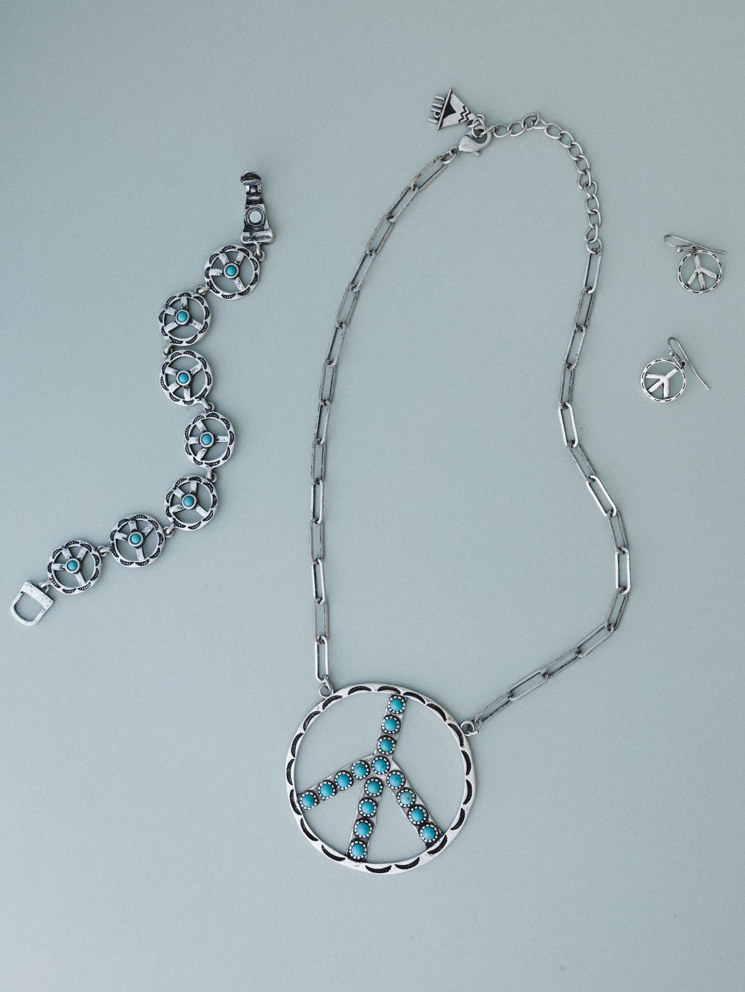 • Complete jewelry set includes a statement peace sign necklace, matching circular link bracelet, and complementary peace sign earrings.