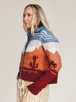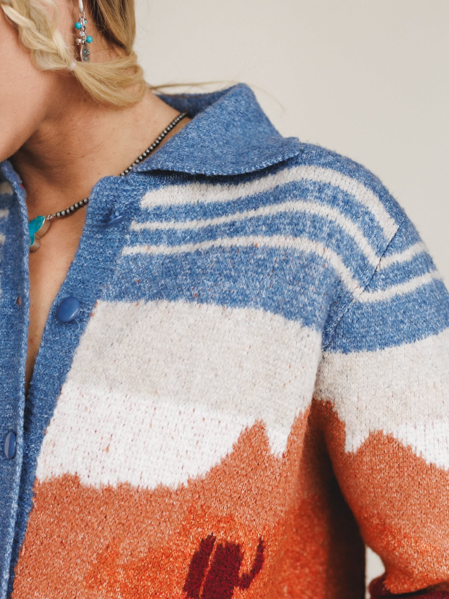 Like a painted desert at golden hour, the Sierra Sunset Sweater Cardigan wraps you in warmth and wanderlust. With a Western-inspired landscape knit into every stitch, this cozy layer captures the spirit of wide open skies and endless adventure.