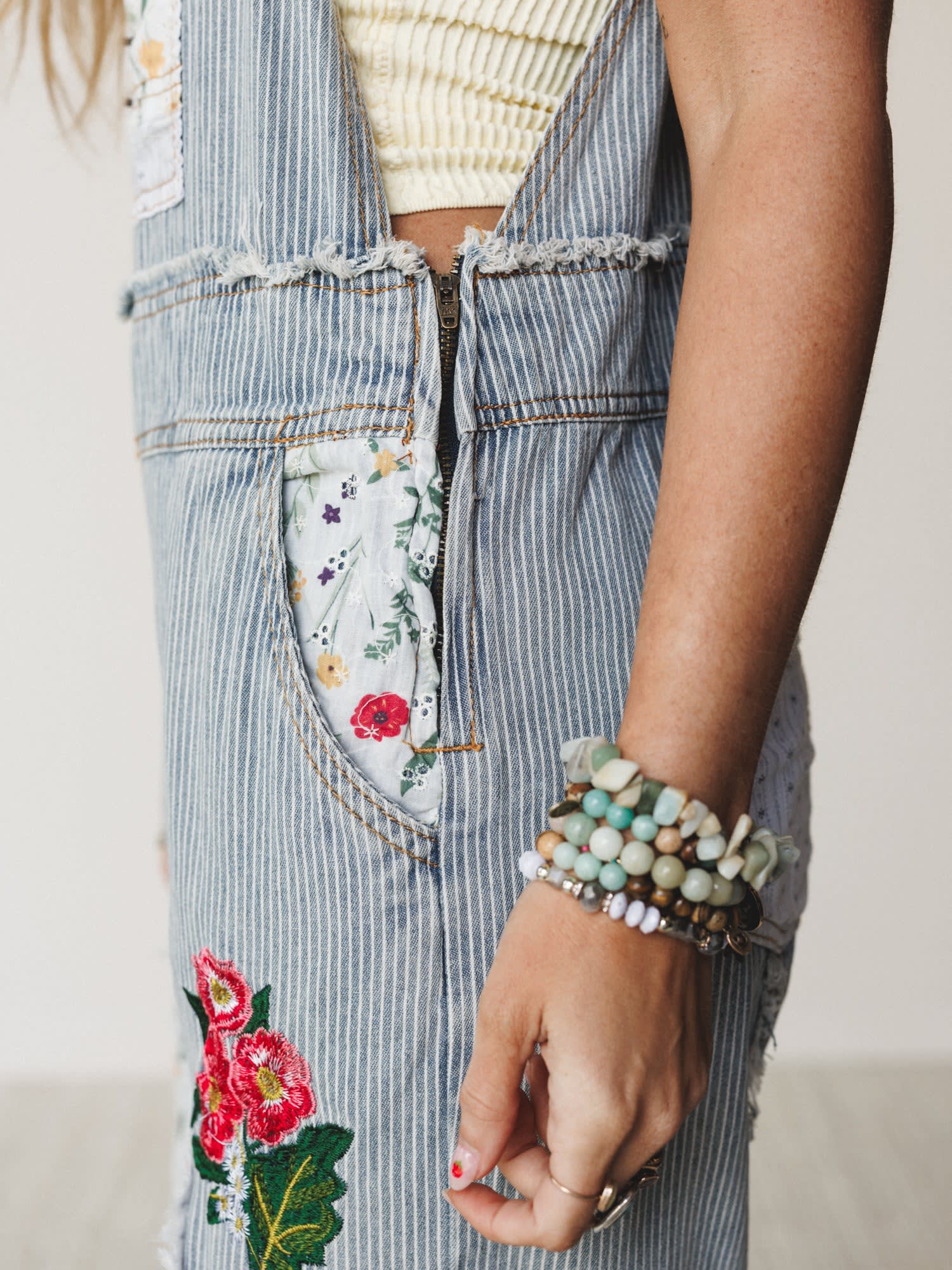 • Mixed fabric construction combines classic denim stripes with delicate floral patchwork panels throughout.
