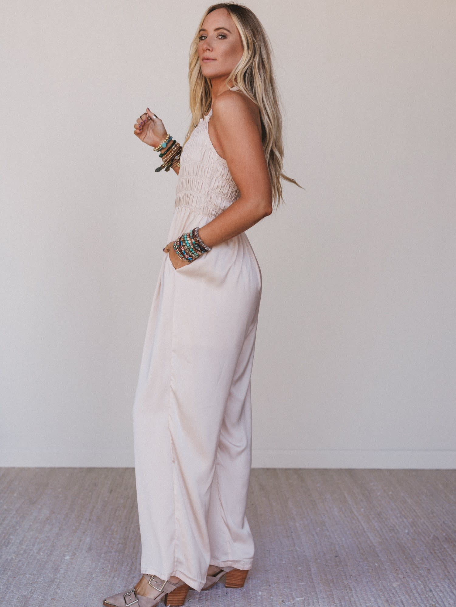 The Slick Step Wide Leg Jumpsuit is pure elegance with an easygoing twist. Featuring a silky-soft finish, flattering halter neckline, and a relaxed wide leg, this piece brings minimal effort with maximum impact. Whether you're headed to a rooftop dinner, engagement brunch, or beach wedding, this jumpsuit moves with grace and shines in every setting.