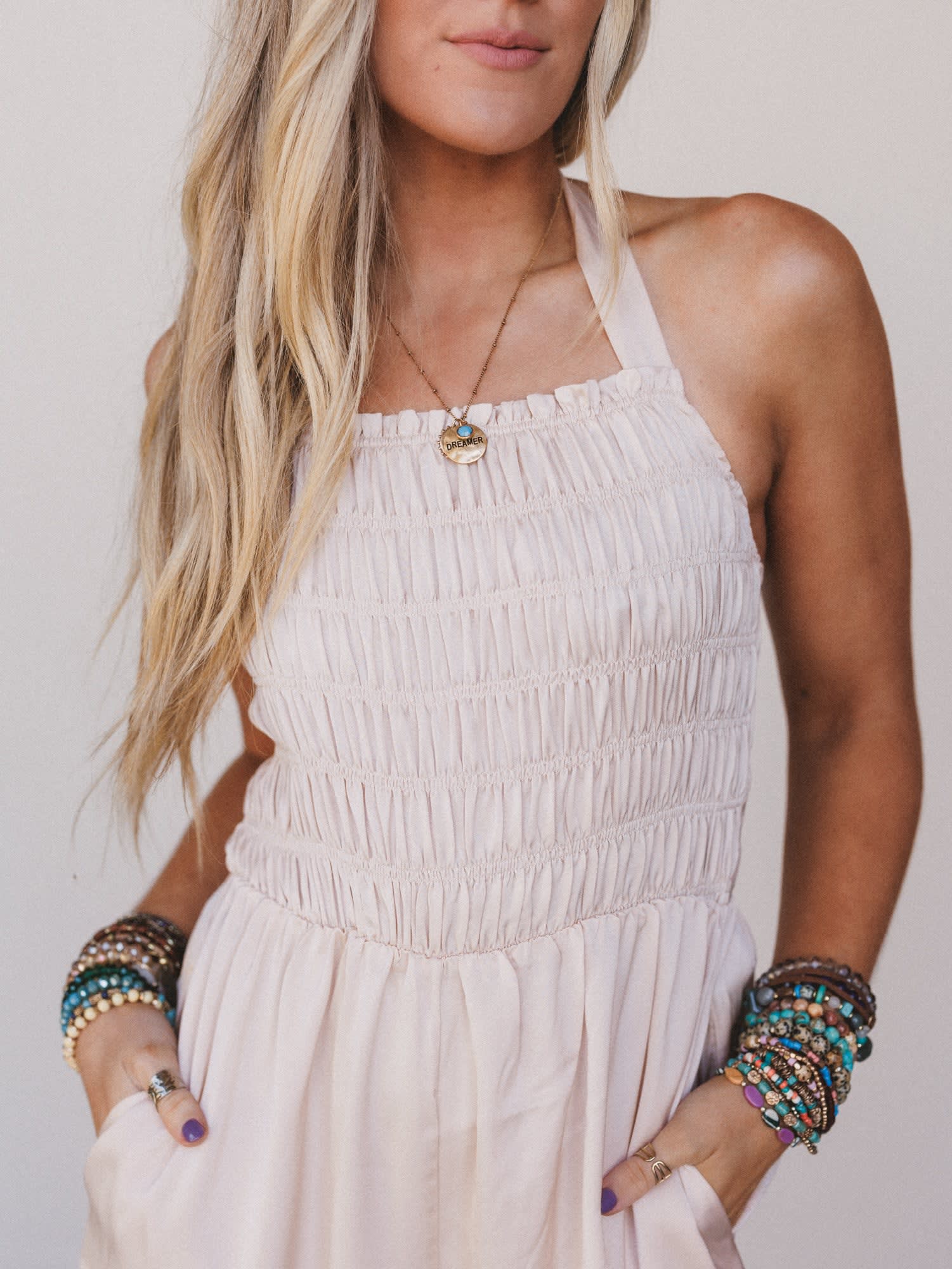 - Halter neck tie with smocked bodice for a fitted, flexible shape